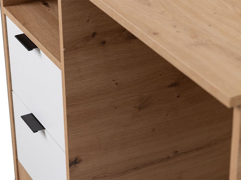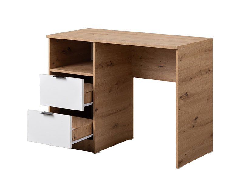Tačan naziv dezena: korpus iverica artisan, front iverica bela. Radni sto MONT 2F je sjajno rešenje za uređenje prostora za rad. Zahvaljujući modernom dizajnu lako će se uklopiti uz ostatak nameštaja u ambijentu, a njegov upotrebni prostor koji čine prostrana radna površina, kao i dve prostrane fioke čine ga funkcionalnim elementom koji zadovoljava sve potrebe tokom aktivnog rada ili učenja u ambijentu doma.