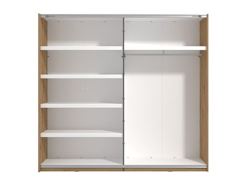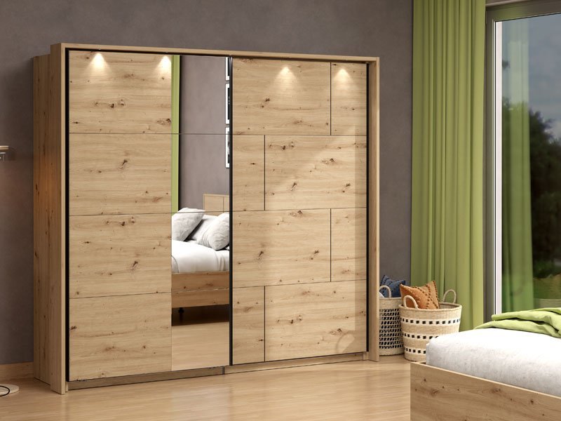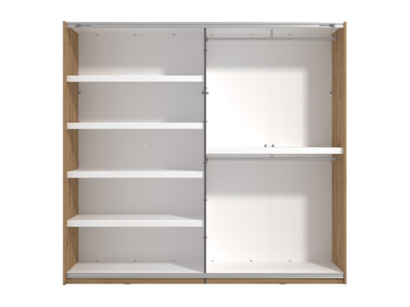 Model garderobera ALERIA 220 OG h205 sa kliznim vratima u artisan hrast dekoru sa printom u pravilnim geometrijskim linijama i segmentom sa ogledalom na levom frontu, doprinosi enterijerskoj funkcionalnosti, estetici i maksimalnoj iskorišćenosti prostora. Upotrebni prostor ovog modela garderobera ALERIA 220 OG h205 čine četiri funkcionalne police za odlaganje odeće sa jedne strane unutrašnjosti garderobera, kao i dve garderobne šipke i jedna polica, koje se, u zavisnosti od potreba, mogu montirati u drugom krilu garderobera, na fotografijama prikazane načine. Ovaj model garderobera poseduje mogućnost dodatne ugradnje usporivača za klizna vrata, rama koji doprinosi vizuelno masivnijem izgledu, kao i mogućnost implementiranja dodatne rasvete. Deo je istoimenog sistema elemenata za opremanje spavaće sobe ALERIA,kao idealnog izbora za savremeno dizajniran enterijer. *Napomena: Cena je bez dodatne opreme. Preporučujemo Set LED rasvete Rb 5k, Ram Fj za garderober 220 h205, Usporivač UT