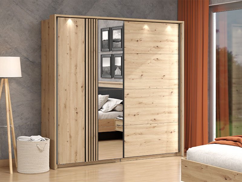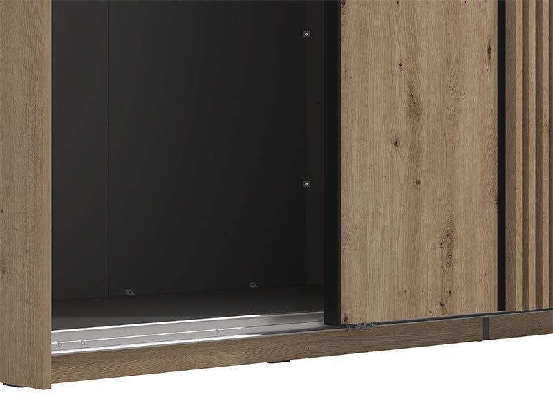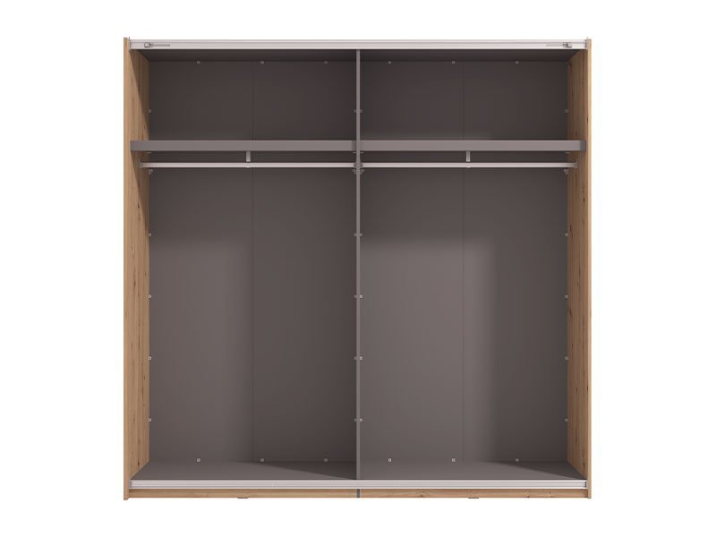 Garderober ASCALON 220 OG h217 u kombinaciji dekora artisan hrasta, artisan hrast folije i crnog dekora, moderno je dizajniran i autentičan komad nameštaja koji će doprineti kako estetici, tako i funkcionalnosti ambijenta spavaće sobe. Segment sa ogledalom na levom frontu, doprinosi enterijerskoj praktičnosti i maksimalnoj iskorišćenosti prostora. Upotrebni prostor ovog modela čine garderobne šipke. Poseduje mogućnost dodavanja polica, vertikala, fioka, usporivača za klizni mehanizam, rama za garderober koji doprinosi izgledu masivnosti, kao mogućnost dodavanja rasvete. Deo je istoimenog sistema elemenata za opremanje spavaće sobe ASCALON, moderne dizajnerske forme. Preporučujemo Set polica Pg3 – w220, Ram Fj za garderober 220 h217, Set LED rasvete Rb 5k, Usporivač UT, Set LED rasvete Rb UL, Set fioka 2F (FUP), Funkcionalna polica FUP 220 h217