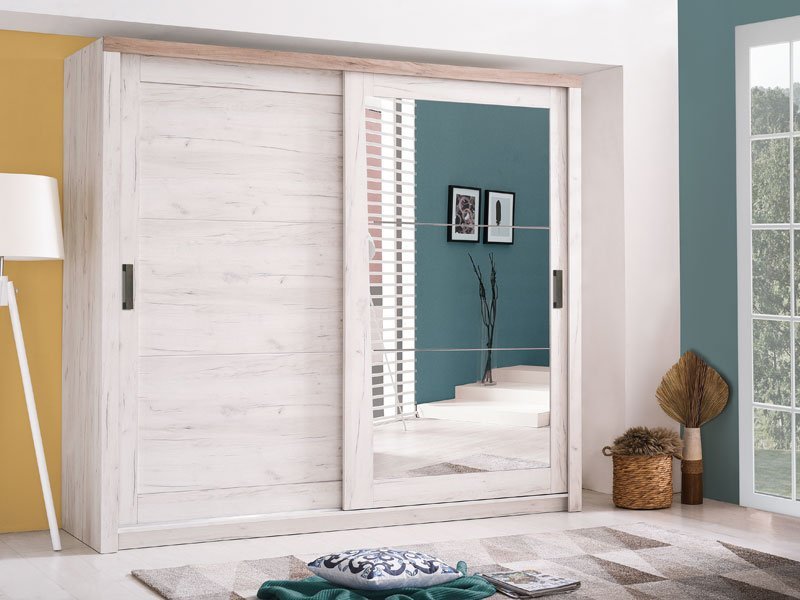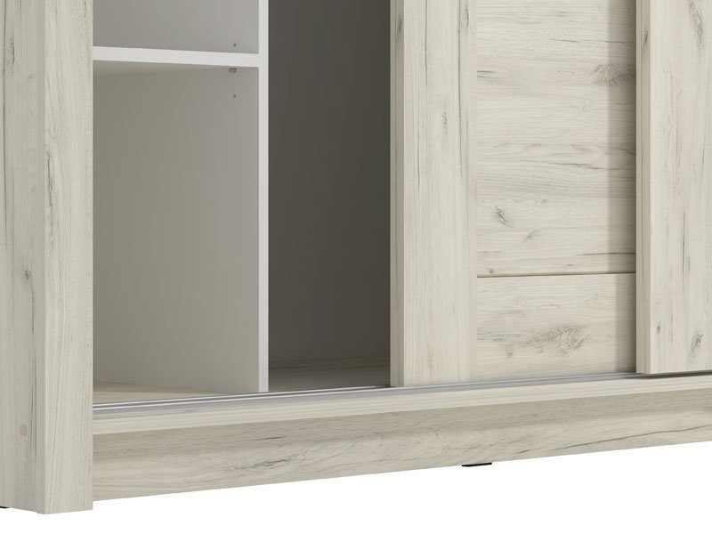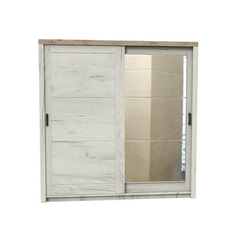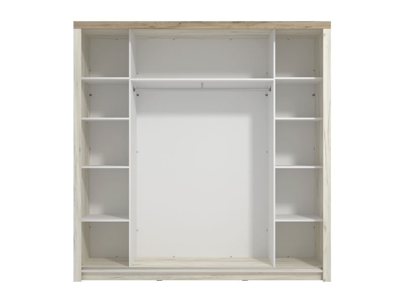 Garderober KENT 225 OG, u belom i sivom hrast dezenu, poseduje bočno smeštene segmente sa policama i centralno pozicioniran deo sa garderobnom šipkom. Poseban benefit ovog modela je ogledalo levo pozicionirano i klizni mehanizam koji doprinosi ekonomičnog organizaciji raspoloživog prostora. Deo je istoimene kolekcije koja u vaš dom unosi dodir otmene klasike i rafiniranog ukusa.