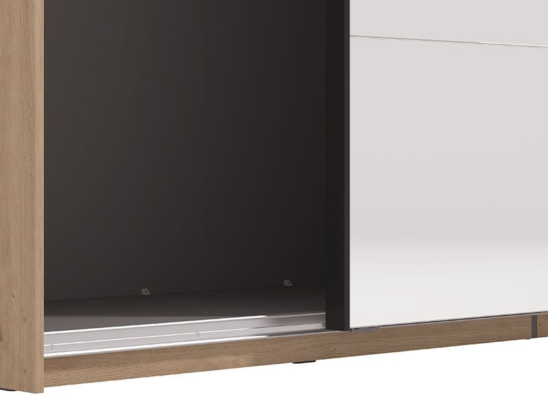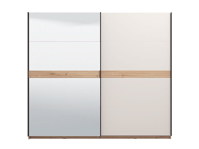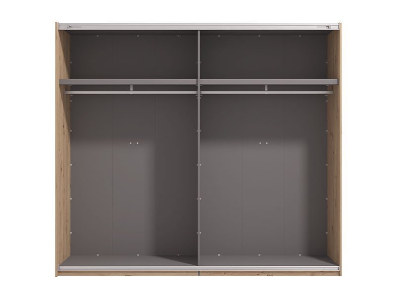 Garderober MODENA 245 OG h217 u kombinaciji dekora artisan hrasta, artisan hrast folije i kašmir dekora, predstavlja spoj funkcionalnog i moderno dizajniranog komada nameštaja koji će doprineti kako estetici, tako i funkcionalnosti ambijenta spavaće sobe. Levi front garderobera prekriven je ogledalom što doprinosi enterijerskoj praktičnosti i maksimalnoj iskorišćenosti prostora. Upotrebni prostor ovog modela čine garderobne šipke. Poseduje mogućnost dodavanja polica, vertikala, fioka, usporivača za klizni mehanizam, rama za garderober koji doprinosi izgledu masivnosti, kao mogućnost dodavanja rasvete. Deo je istoimenog sistema elemenata za opremanje spavaće sobe MODENA, moderne dizajnerske forme. *Napomena: Cena je bez dodatne opreme. Preporučujemo Set polica Pg3 – w245, Ram Fj za garderober 245 h217, Set fioka 2F (FUP), Set LED rasvete Rb 6k, Usporivač UT, Set LED rasvete Rb UL, Funkcionalna polica FUP 245 h217