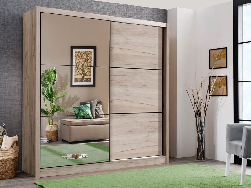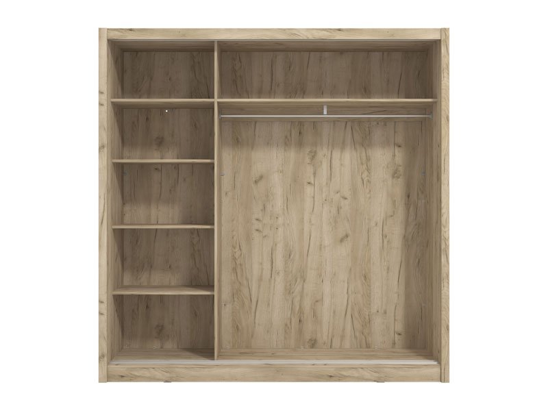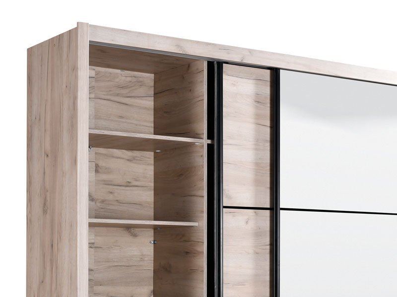 Garderober NAVARA 215 OG u dezenu sivog hrasta je moderno dizajnirano i praktično rešenje za odlaganje. Unutrašnjost se sastoji od segmenta sa policama u levom delu i prostranog segmenta sa garderobnom šipkom u središnjem i desnom delu. Poseban benefit ovog modela je klizni mehanizam koji doprinosi ekonomičnoj organizaciji raspoloživog prostora, kao i ogledalo na levom kliznom elementu. Deo je linije NAVARA garderobera, tako da je stilski uklopiv i sa ostalim modelima.