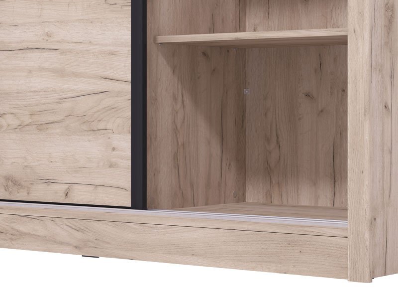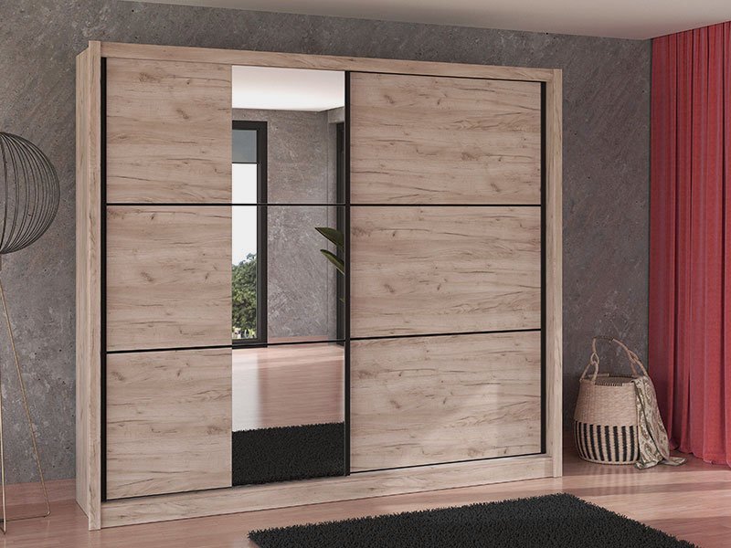 Model garderobera NAVARA 245 OG 2K sa kliznim vratima, u dekoru sivog hrasta, i segmentom sa ogledalom na levom frontu, obećava enterijersku praktičnost i maksimalnu iskorišćenost prostora. Upotrebni prostor ovog modela čine police u levom i desnom delu, kao i garderobna šipke u središnjem delu.