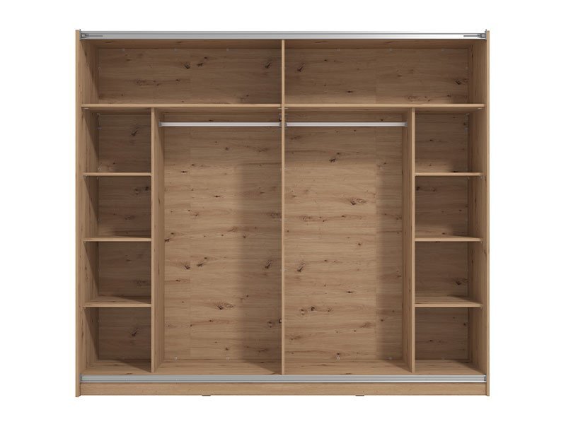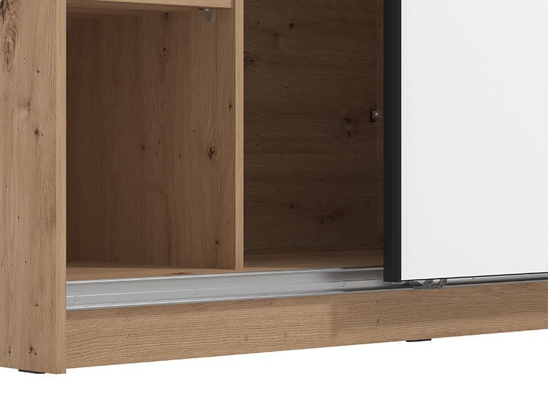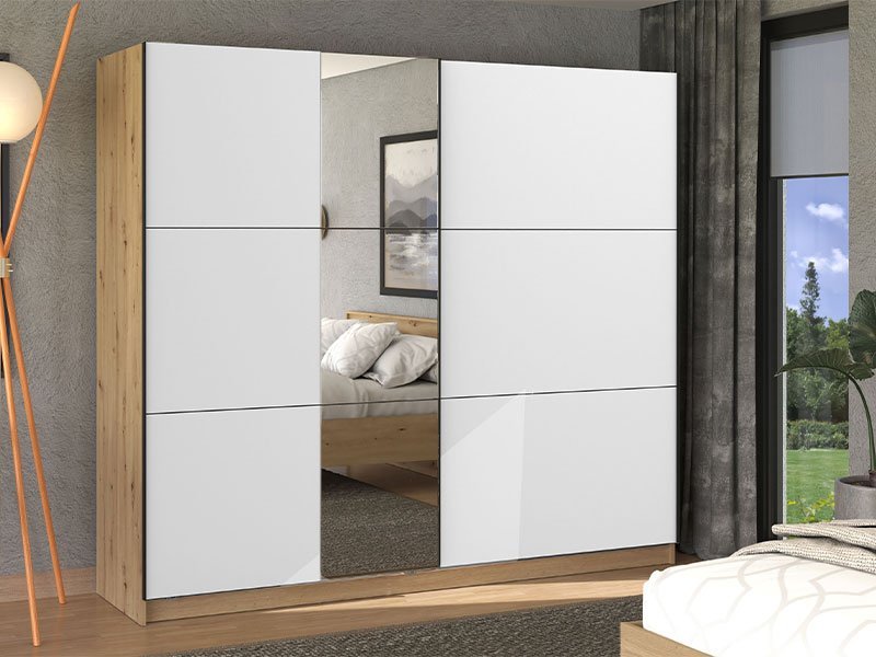 Garderober SIERRA 240 OG u opak belom i artisan hrast dekoru predstavlja model garderobera savremenog dizajna i velike praktične upotrebne vrednosti. Unutrašnjost se sastoji od segmenta sa policama u levom i desnom delu, kao i segmenta sa garderobnom šipkom u središnjem delu. Poseban benefit ovog modela je klizni mehanizam koji doprinosi ekonomičnoj organizaciji raspoloživog prostora, kao i ogledalo na polovini levog kliznog elementa koje ima i funkcionalnu i estetsku vrednost. Poseduje mogućnost ugradnje usporivača kod kliznog mehanizma koji dodatno doprinose sigurnosti i funkcionalnosti. *Napomena: Cena je bez dodatne opreme.