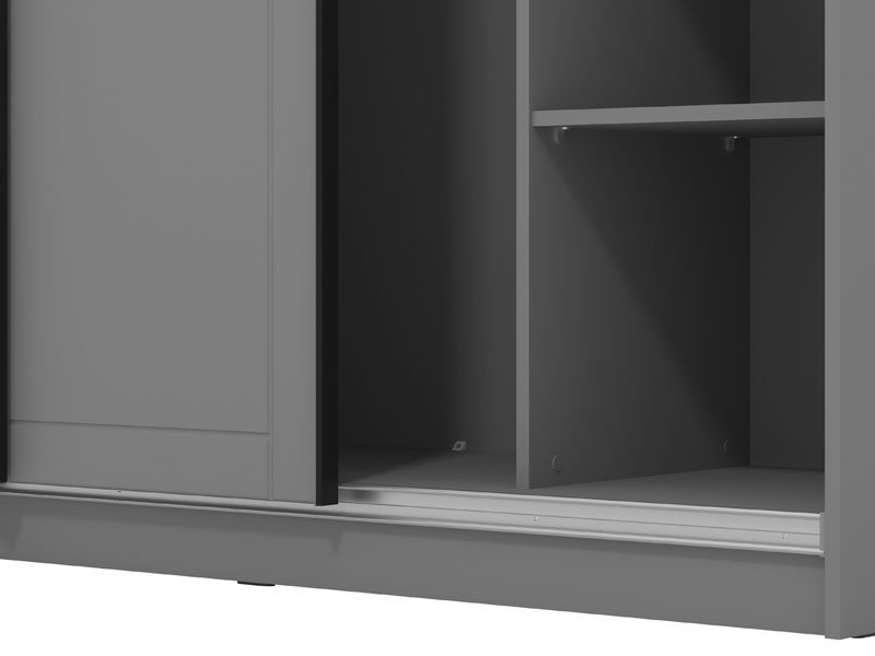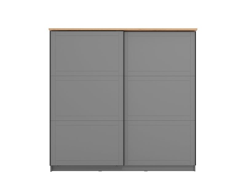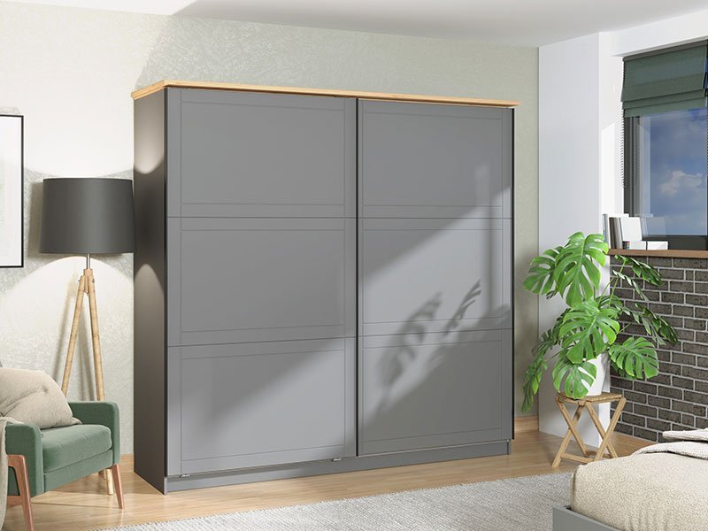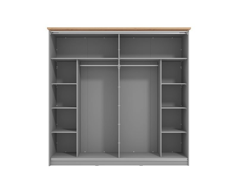 Garderober VALENCIA 220 u kombinaciji dekora artisan hrasta, grafit sive i sive mat folija, koja unosi u prostor suptilniju, monohromatsku notu i predstavlja model garderobera savremenog dizajna i velike praktične upotrebne vrednosti. Unutrašnjost se sastoji od segmenta sa policama u levom i desnom delu, kao i segmenta sa garderobnim šipkama u centralnom delu. Poseban benefit ovog modela je klizni mehanizam koji doprinosi ekonomičnoj organizaciji raspoloživog prostora. Poseduje mogućnost ugradnje usporivača kod kliznog mehanizma koji dodatno doprinose sigurnosti i funkcionalnosti.