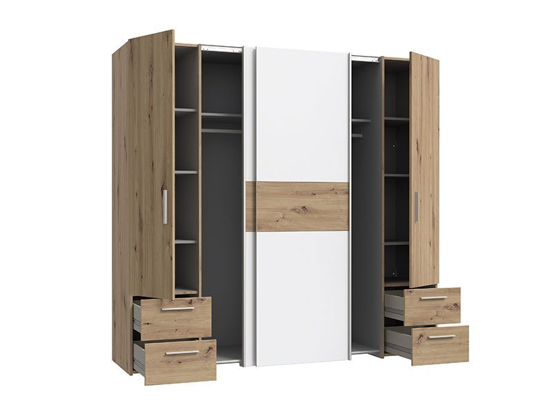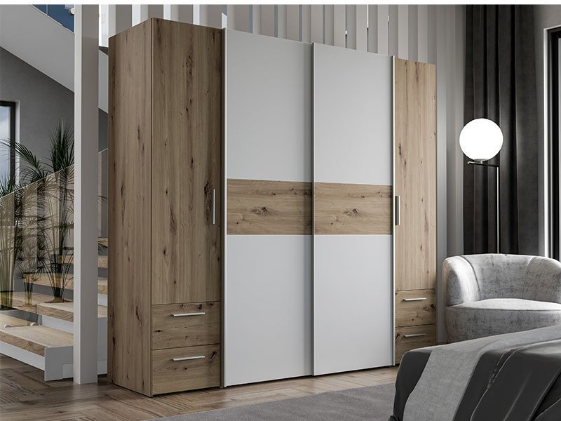 Tačan naziv dezena: korpus iverica artisan, front iverica bela/artisan.  Klizni garderober KAPAZA predstavlja model garderobera savremenog dizajna i velike praktične upotrebne vrednosti. Unutrašnjost se sastoji od segmenta sa policama u levom i desnom delu, kao i središnjeg segmenta sa dve garderobne šipke i nosećim policama. Poseban benefit ovog modela je klizni mehanizam koji doprinosi ekonomičnoj organizaciji raspoloživog prostora.