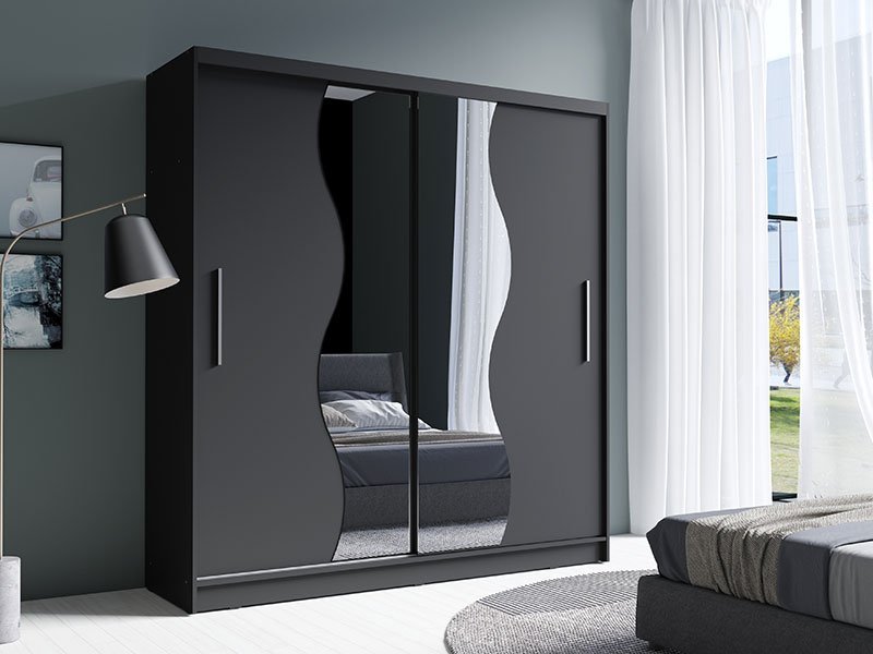 Tačan naziv dezena je: korpus iverica crna, front iverica crna ogledalo. Klizni garderober BERGAMO M sa ogledalom savremenog dizajna i praktične forme u vaš dom uneće dozu elegenacije i minimalizma. Upotrebni prostor ispunjen je delom sa garderobnom šipkom, kao i delom sa dva seta polica.