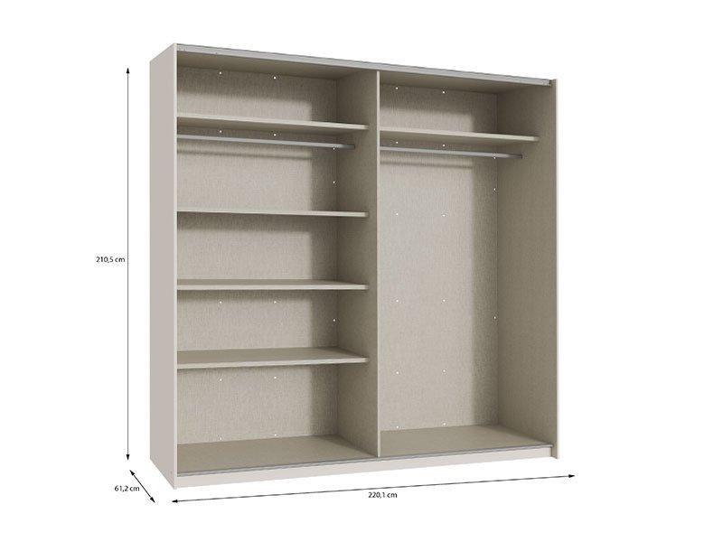 Tačan naziv dezena: korpus/front iverica boja peska. Model kliznog garderobera MATT 220 OG obećava enterijersku praktičnost i istaknutu estetiku prostora. Osnovna forma ovog modela poseduje garderobnu šipku i noseću policu u desnom krilu, dok se u levom krilu garderobera nalaze prostrane, praktične, police za odlaganje. Ono što ovaj garderober čini izuzetno funkcionalnim izborom je to što u zavisnosti od vaših potreba možete odabrati opremu koja će vam omogućiti bolju organizaciju, kao i unaprediti estetiku. Preporuke za dodatnu opremu su ram za garderober, set fioka, dodatna polica za izdvajanje upotrebnog prostora, ugradni metalni čiviluk, metalna korpa za odlaganje, kao i ugradni metalni cipelar. Dostupnost ovih elemenata dodatne opreme za klizni garderober MATT 220 OG omogućava maksimalnu iskorišćenost prostora, po meri vaših potreba. *Napomena: Cena je bez dodatne opreme. Preporučujemo Ram za klizni garderober MATT, Set fioka za garderober ŠAH 220 h210 L, Dodatna polica za garderober ŠAH 220 h210, Ugradni metalni čiviluk za garderober ŠAH 220 h210, Ugradna metalna korpa za garderober ŠAH 220 h210, Ugradni metalni cipelar za garderober ŠAH 220 h210