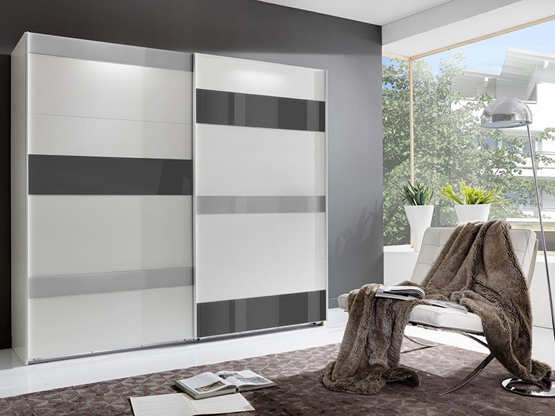 Tačan naziv dezena je: korpus iverica bela, front iverica bela, staklo crna / svetlo siva. Klizni garderober NICA 225 savremenog dizajna, funkcionalnosti i veoma izražene estetike, je moderno dizajnersko rešenje za uređenje spavaće sobe. Zahvaljujući upotrebnom prostoru, koji čine dve garderobne šipke i dve prostrane police, predstavlja komforno rešenje za odlaganje. Ovaj atraktivni klizni garderober jedan od elemenata moderno dizajnirane spavaće sobe NICA. *Napomena: Cena je bez dodatne opreme. Preporučujemo Set polica 110 cm W, Usporivač UT