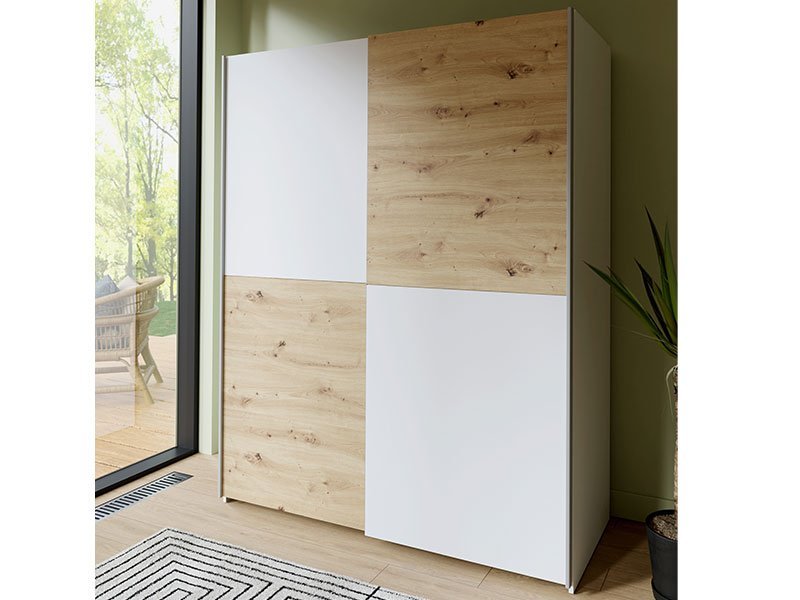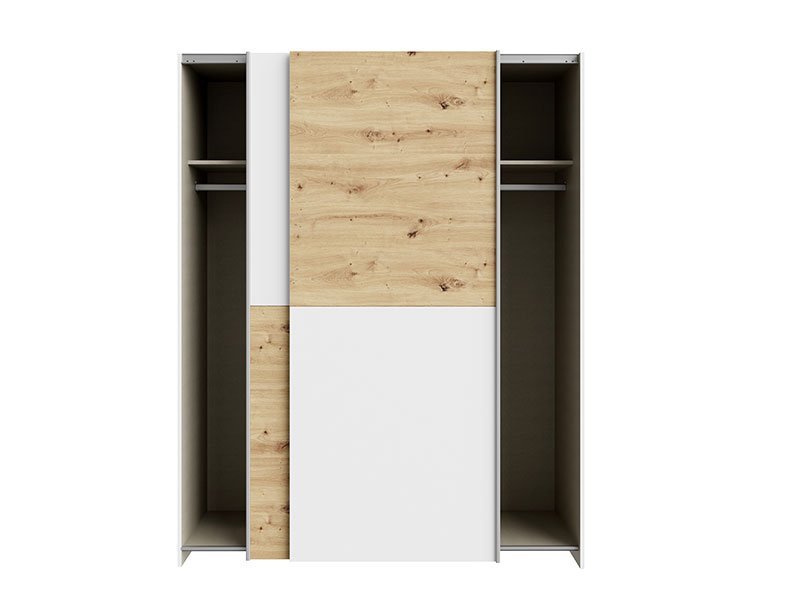 Tačan naziv dezena: korpus iverica bela, front iverica bela/artisan hrast. Model kliznog garderobera ŠAH 150 obećava enterijersku praktičnost i maksimalnu iskorišćenost prostora sa garderobnom šipkom i nosećom policom. Raspored dekora na frontovima se može odabrati prilikom montaže.   *Napomena: Cena je bez dodatne opreme. Preporučujemo Set polica za garderober ŠAH 150