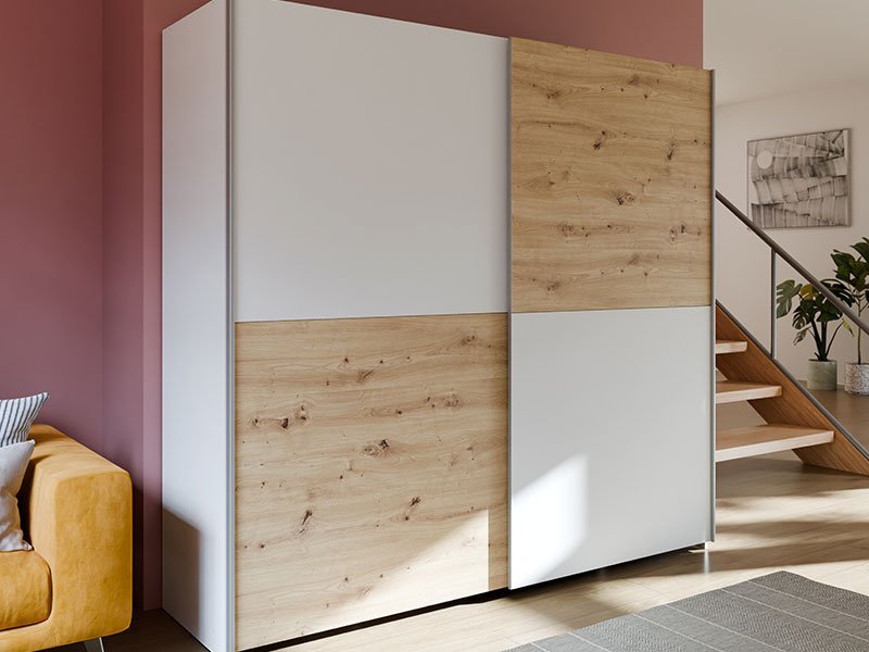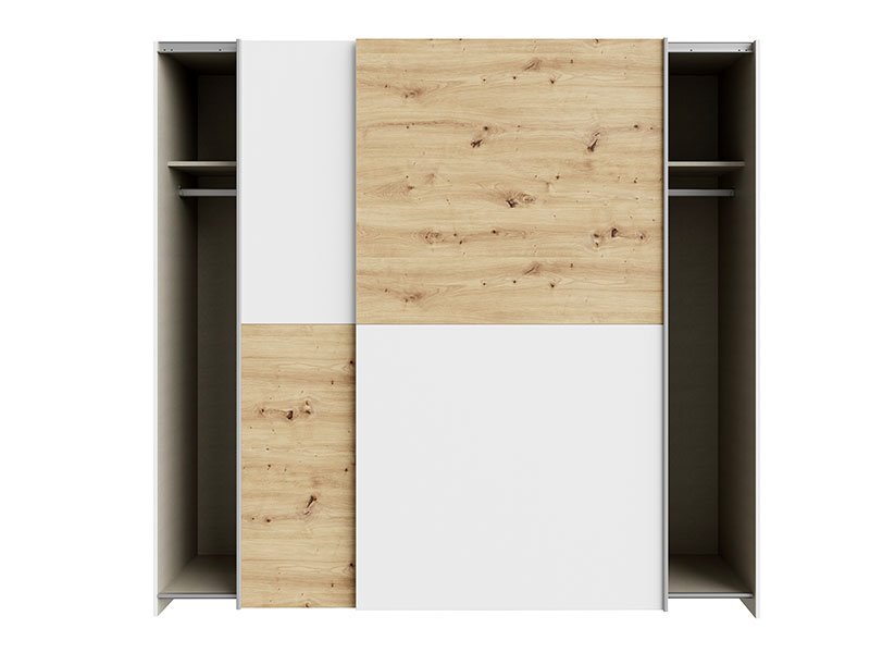 Tačan naziv dezena: korpus iverica bela, front iverica bela/artisan hrast. Model kliznog garderobera ŠAH 200 obećava enterijersku praktičnost i maksimalnu iskorišćenost prostora sa garderobnom šipkom i nosećom policom. Raspored dekora na frontovima se može odabrati prilikom montaže.   *Napomena: Cena je bez dodatne opreme. Preporučujemo Set polica za garderober ŠAH 200