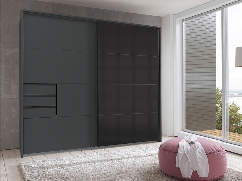 Tačan naziv dezena je: korpus / front iverica grafit siva, staklo crna. Klizni garderober SAIGON 225 savremenog dizajna, funkcionalnosti i veoma izražene estetike, je moderno dizajnersko rešenje za uređenje spavaće sobe. Zahvaljujući upotrebnom prostoru, koji čine garderobna šipka, prostrane police i fioke, predstavlja komforno rešenje za odlaganje. Ovaj atraktivni klizni garderober jedan od elemenata za moderno dizajnirane spavaće sobe. *Napomena: Cena je bez dodatne opreme. Preporučujemo Ram za garderober 225 S, Usporivač UT