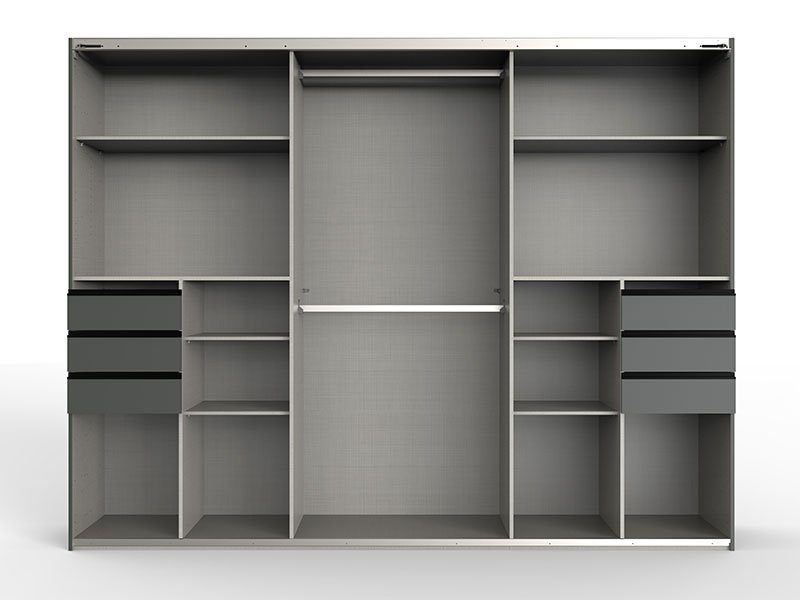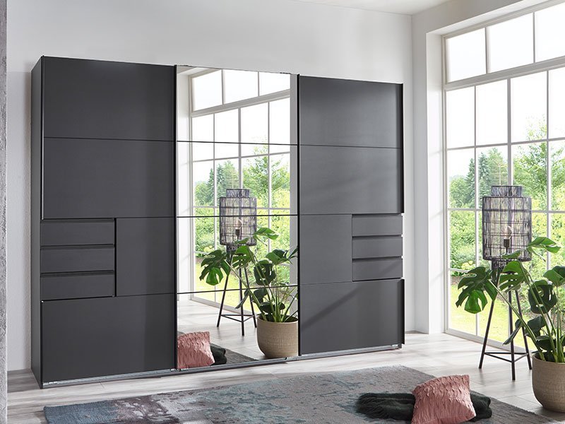 Tačan naziv dezena je: korpus / front iverica grafit siva, ogledalo. Klizni garderober SAIGON 270 savremenog dizajna, funkcionalnosti i veoma izražene estetike, je moderno dizajnersko rešenje za uređenje spavaće sobe. Zahvaljujući upotrebnom prostoru, koji čine dve garderobna šipke, prostrane police i fioke, predstavlja komforno rešenje za odlaganje. Ovaj atraktivni klizni garderober jedan od elemenata za moderno dizajnirane spavaće sobe. *Napomena: Cena je bez dodatne opreme. Preporučujemo Ram za garderober 270 S