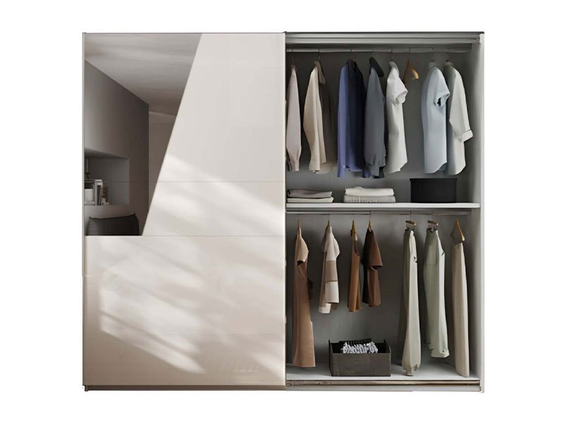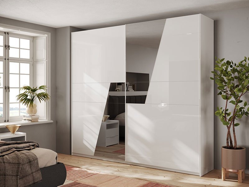 Tačan naziv dezena je: korpus iverica bela, front iverica bela sjaj, ogledalo. Klizni garderober TAYLOR 270 savremenog dizajna, funkcionalnosti i veoma izražene estetike, u vaš dom uneće pravu dozu ambijentalne ozbiljnosti. Upotrebni prostor čine četiri garderobne šipke, po dve sa leve i desne strane. Deo je kolekcije za opremanje spavaće sobe TAYLOR.