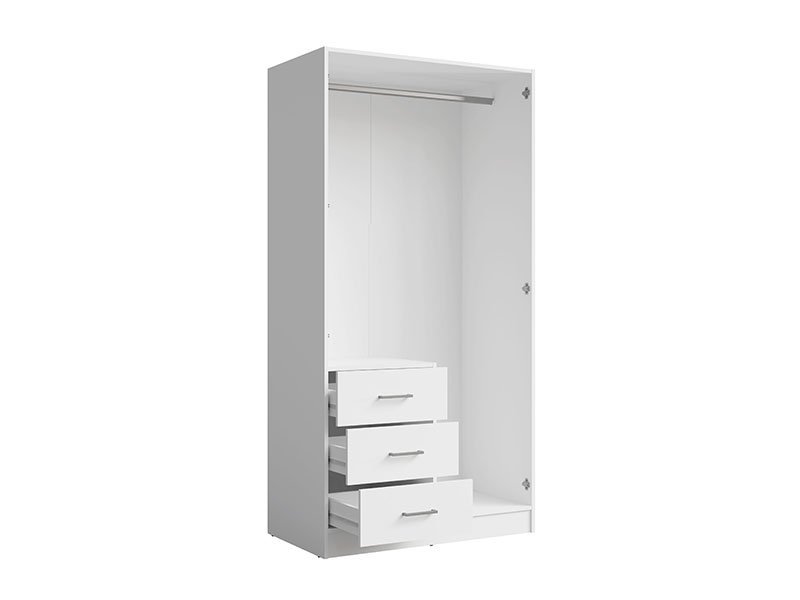 Tačan naziv dezena je: korpus iverica bela, front iverica bela ogledalo. Ormar APOLO 2V3FO je praktični model dvokrilnog ormara sa ogledalom na jednom frontu. Upotrebni prostor čini garderobna šipka i tri funkcionalne fioke. Odlično je rešenje za moderne ambijente doma, sa karakteristikama visoke funkcionalnosti.