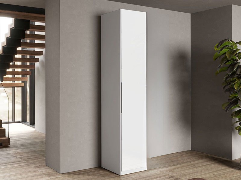 Tačan naziv dezena: korpus iverica bela, front iverica bela sjaj. Ormar BROOKLYN 1V  je praktični model jednokrilnog ormara koji i sam može poslužiti za potpuno iskorišćenje prostora u ambijentima doma, mada potpunu funkciju ima tek u sklopu spavaće sobe BROOKLYN čiji je jedan element, važan za organizaciju prostora. Upotrebni prostor ormara BROOKLYN 1V čine dve garderobne šipke raspoređene na dve visine i središnja polica.