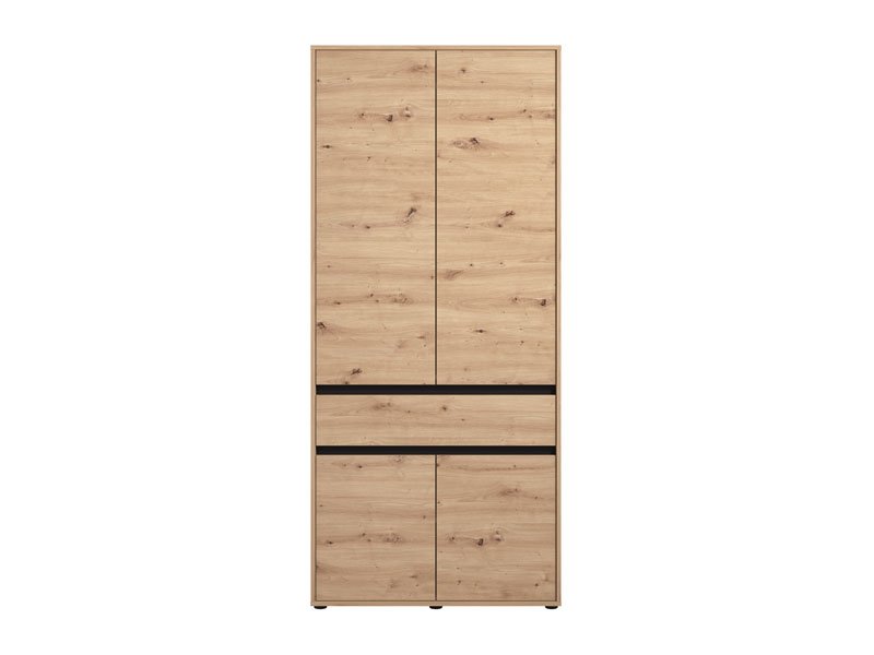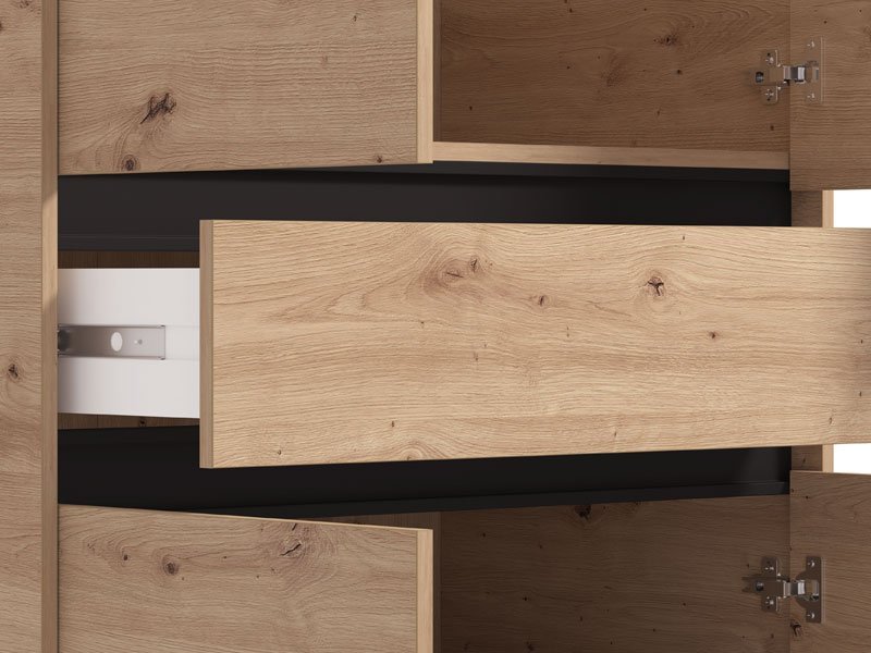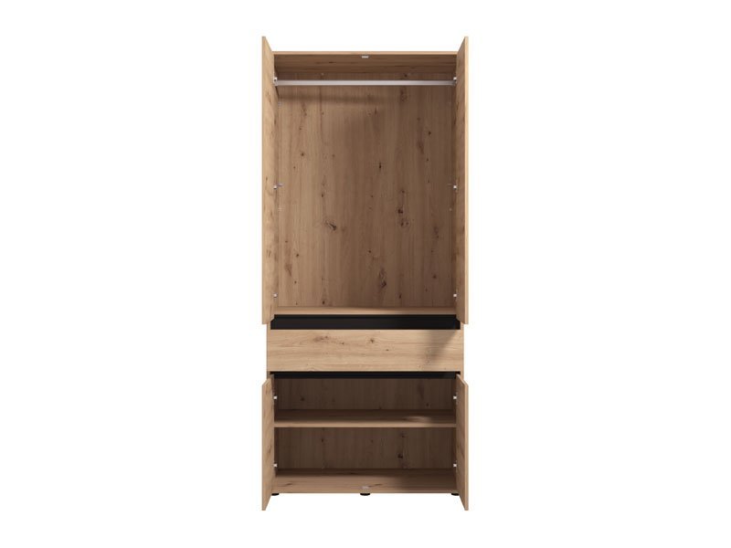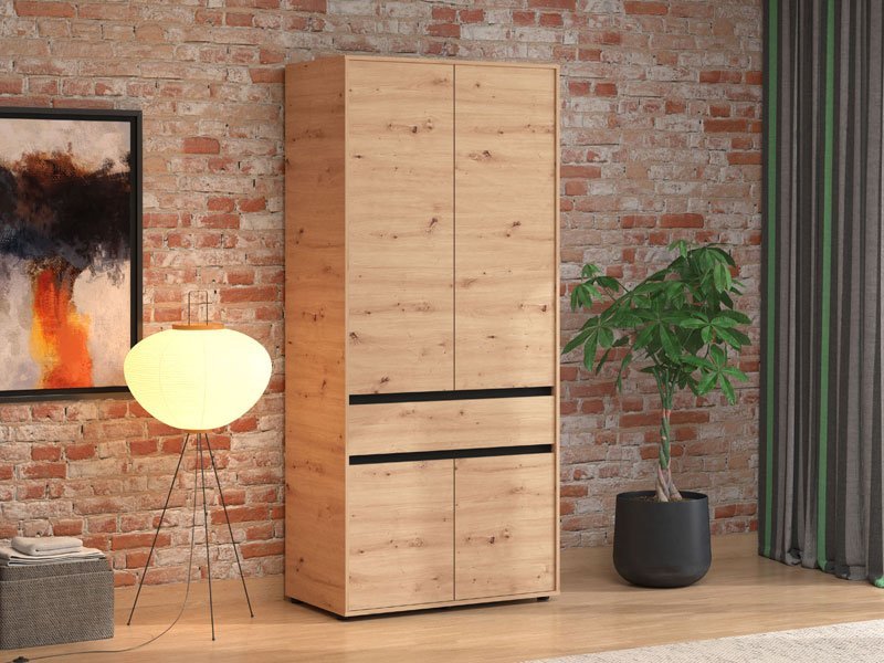 Ormar CORBETT 2K1F h211 u kombinaciji dekora artisan hrasta i crne mat folije, sa garderobnom šipkom u gornjem delu, jednom praktičnom fiokom u središnjem delu i zatvorenim pregradnim segmentom u donjem delu,  funkcionalno i estetski će doprineti organizaciji ambijenta.