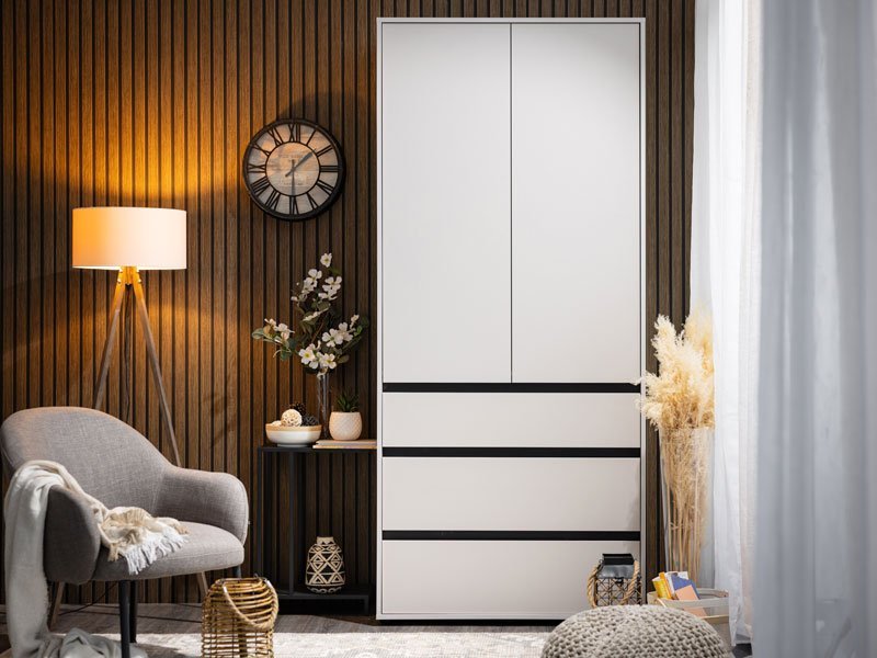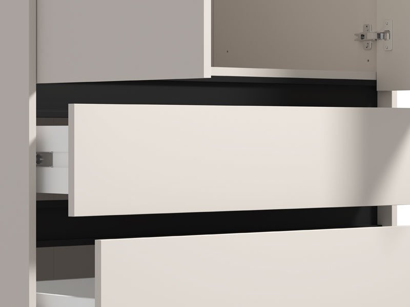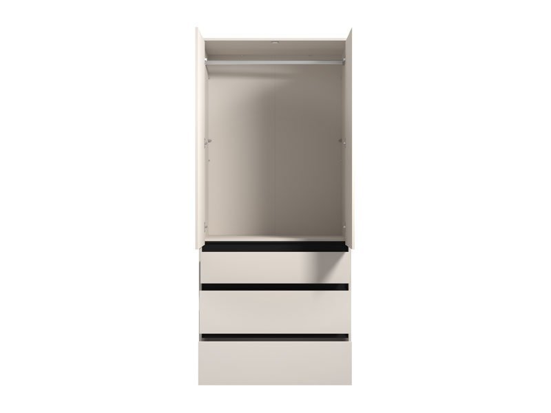 Ormar CORBETT 2K3F h211 u kombinaciji kašmir dekora i crne mat folije, sa garderobnom šipkom u gornjem delu i tri praktične fioke u donjem delu, funkcionalno i estetski će doprineti organizaciji ambijenta.