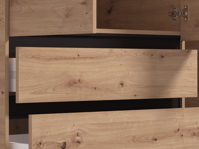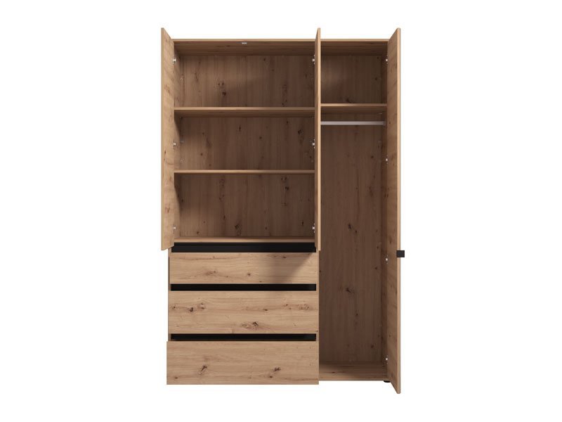 Ormar CORBETT 3K3F1O h211 u kombinaciji dekora artisan hrasta i crne mat folije, deo je kolekcije CORBETT ormara. Upotrebni prostor čine garderobna šipka u krilu iza ogledala, dok gornji deo srednjeg i levog krila čini zatvoreni pregradni deo, ispod koga su tri prostrane fioke. Ovakav model ormara će funkcionalno doprineti organizaciji ambijenta, ali i unaprediti njegovu estetiku.