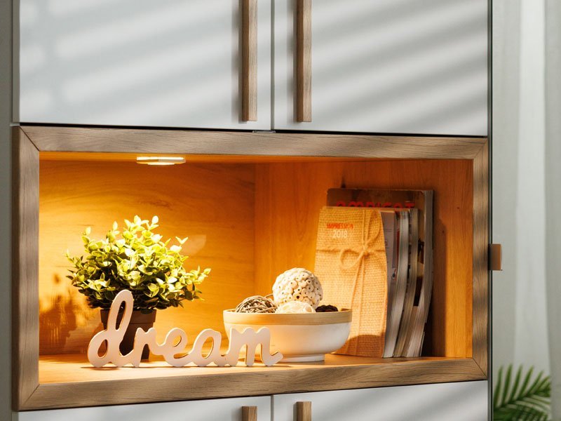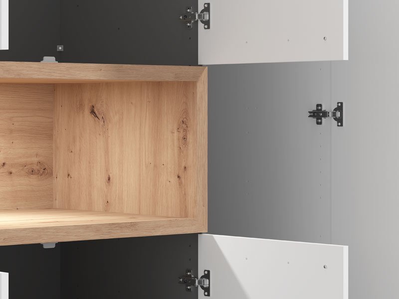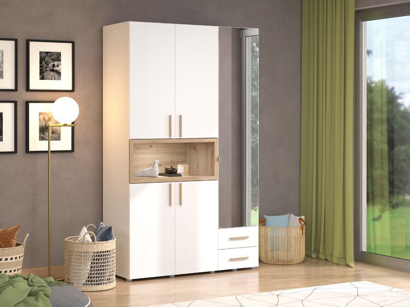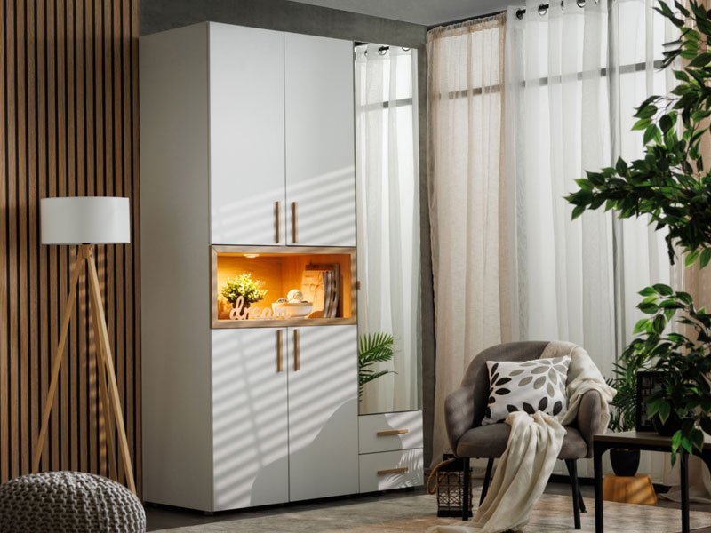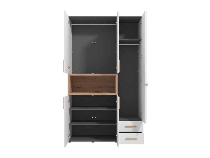Ormar DONALD 3K2F1O h227 u kombinaciji opak belog dekora, dekora artisan hrasta i artisan hrast folije, deo je kolekcije ormara DONALD. Upotrebni prostor ovog trokrilnog ormara čini deo sa garderobnom šipkom, dva zatvorena pregradna dela, dve fioke i jedna otvorena polica. Ovaj model ormara poseduje i ogledalo, što doprinosi i njegovoj funkcionalnosti i estetici ambijenta i čini ga odličnim izborom za različite ambijente u modernom domu. Poseduje mogućnost ugradnje dodatne rasvete. *Napomena: Cena je bez dodatne opreme. Preporučujemo Set spot svetla 1 SVETILJKA