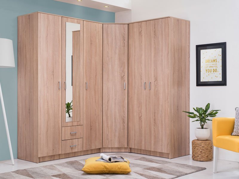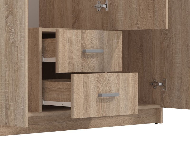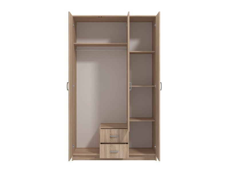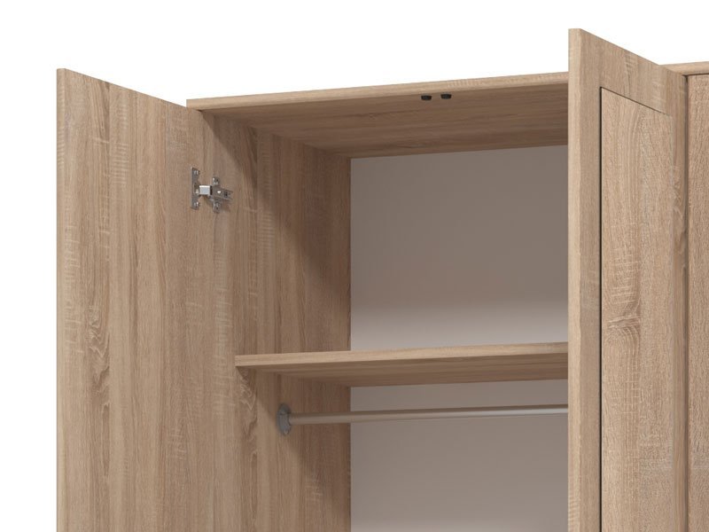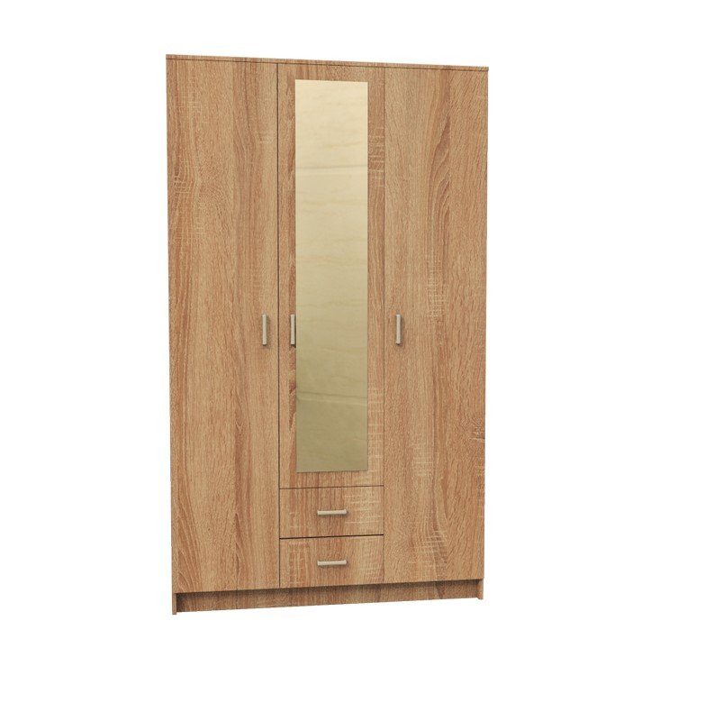 Elegantni trokrilni model ormara HANA 3K2FO, u sonoma hrast dezenu, sa garderobnom šipkom, tri police i dve fioke, funkcionalno će doprineti organizaciji ambijenta. Ogledalo na središnjem delu ormara HANA 3K2FO estetski će oplemeniti životni prostor.