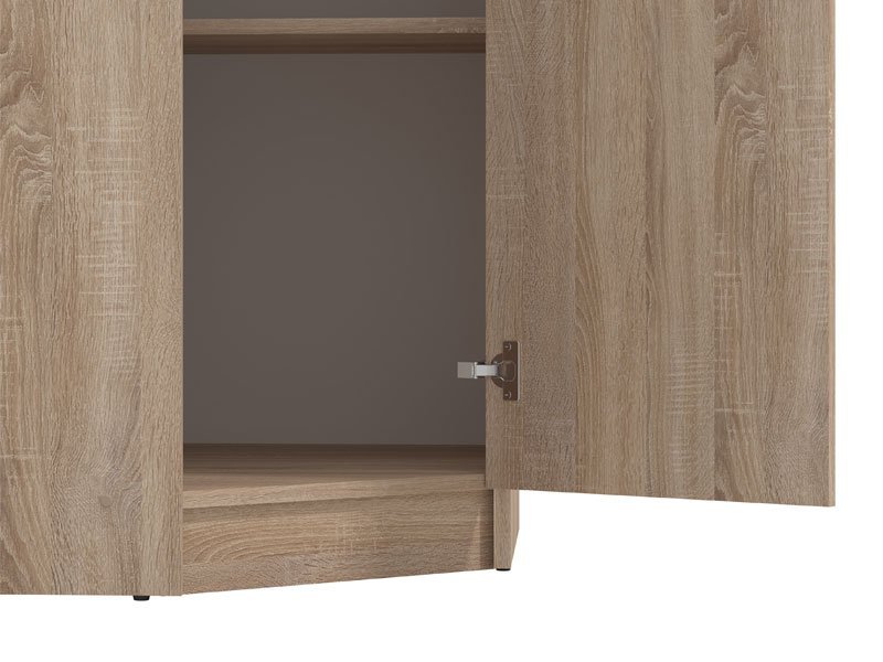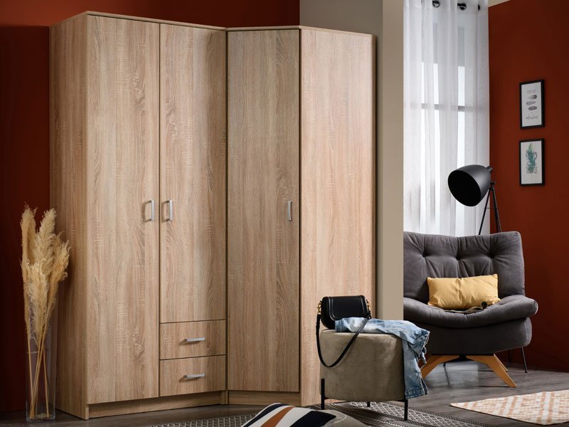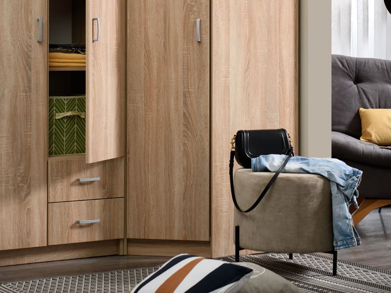 Funkcionalni model ormara HANA UGAONI, u sonoma hrast dezenu, efektno racionalizuje ugaoni prostor u enterijeru namenjen odlaganju odeće. Uspešno organizovan prostor ormara HANA UGAONI sastoji se od polica i garderobne šipke.