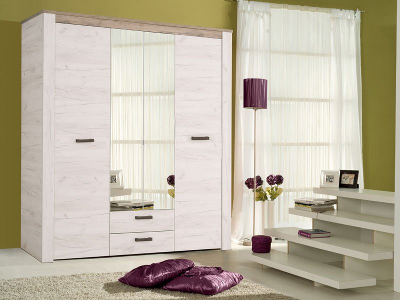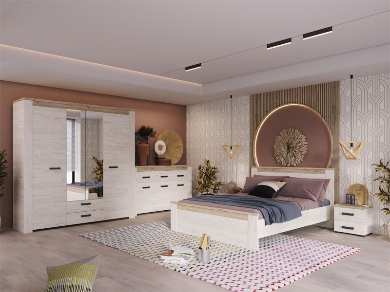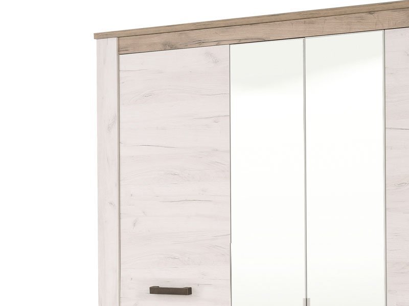 Ormar KENT 4K2F2O, u kombinaciji dezena belog i sivog hrasta, deo je istoimene kolekcije koja u vaš dom unosi dodir otmene klasike i rafiniranog ukusa. Ovaj model poseduje segment sa policama centralno pozicioniran, delove sa garderobnim šipkama i dve praktične fioke.