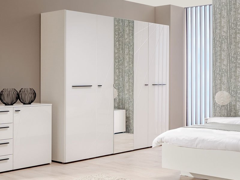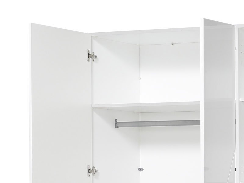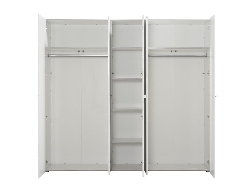 Ormar KSANTI 5K1O, u opak belom dezenu sa frontovima presvučenim belom 3D MDF folijom sa aplikacijom, deo je istoimene kolekcije elemenata spavaće sobe. Upotrebni prostor je maksimalno iskorišćen i sastoji se od seta polica u središnjem delu, i dve garderobne šipke bočno pozicionirane. Ormar KSANTI 5K1O ima veliko ogledalo smešteno na centralnom delu. Poseduje mogućnost dodavanja polica. *Napomena: Cena je bez dodatne opreme.