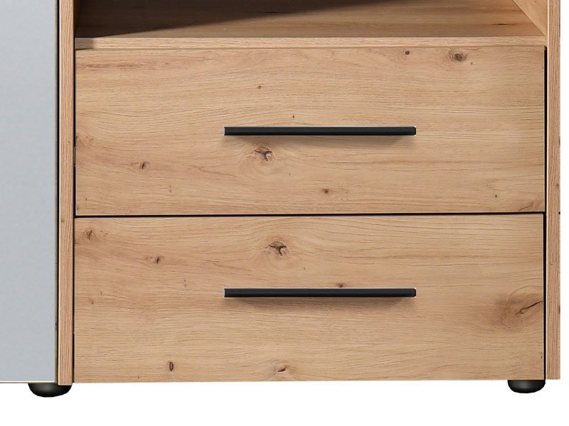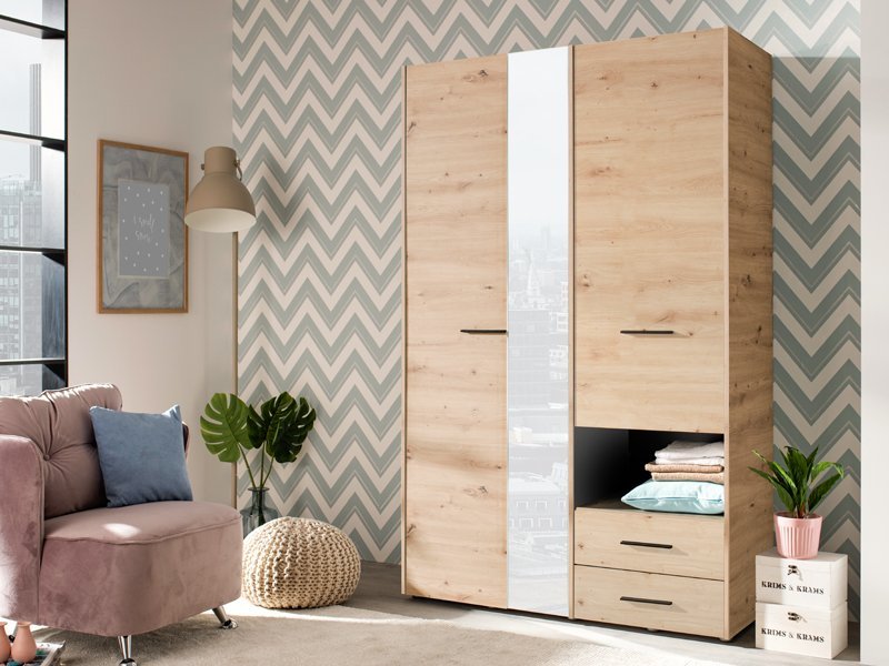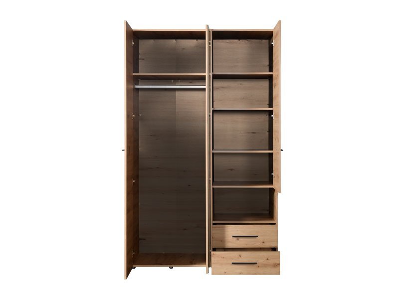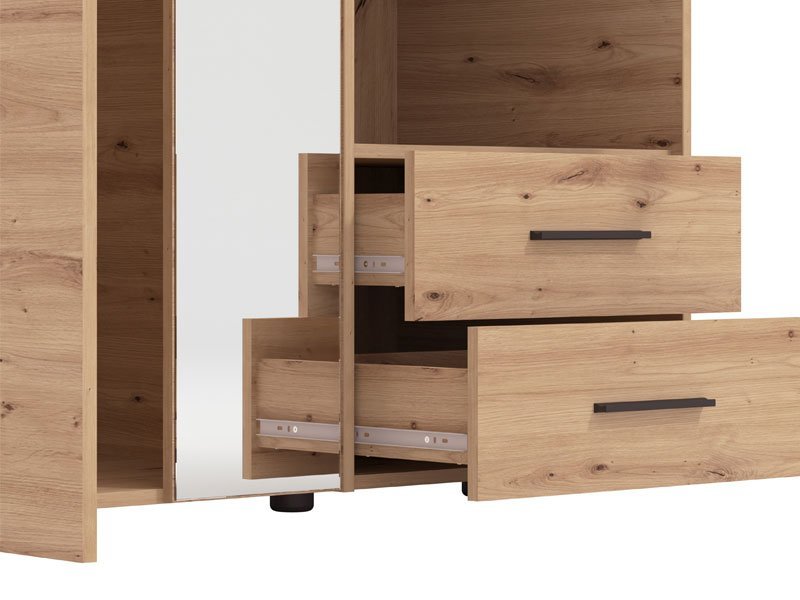 Ormar LEON 3K2FO u dekoru artisan hrasta, sa garderobnom šipkom sa leve, policama i dve fioke sa desne strane, funkcionalno će doprineti organizaciji ambijenta. Ogledalo na središnjem delu ormara LEON 3K2FO estetski će oplemeniti i vizuelno povećati ambijent životnog prostora u kome se nalazi.