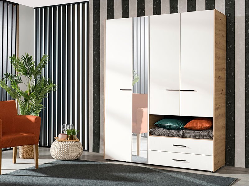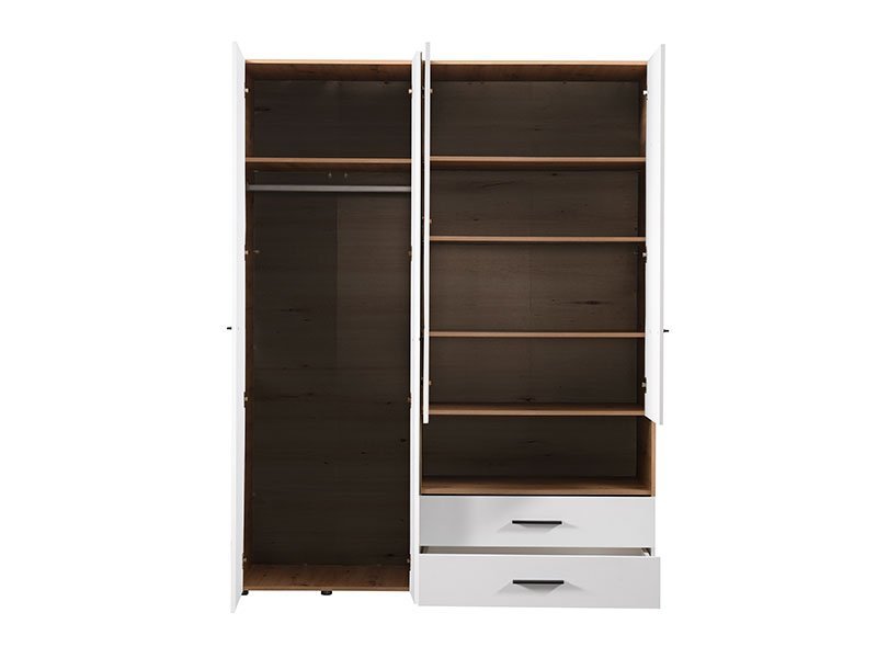 Ormar LEON 4K2FO u dekoru, artisan hrast i opak belom, sa garderobnom šipkom sa leve strane, dvokrilno zatvorenim policama, kao i jednom otvorenom policom i dve fioke sa desne strane, funkcionalno će doprineti organizaciji ambijenta. Ogledalo na središnjem delu ormara LEON 4K2FO estetski će oplemeniti i vizuelno povećati ambijent životnog prostora u kome se nalazi.korpus artisan hrast, front opak bela ogledalo