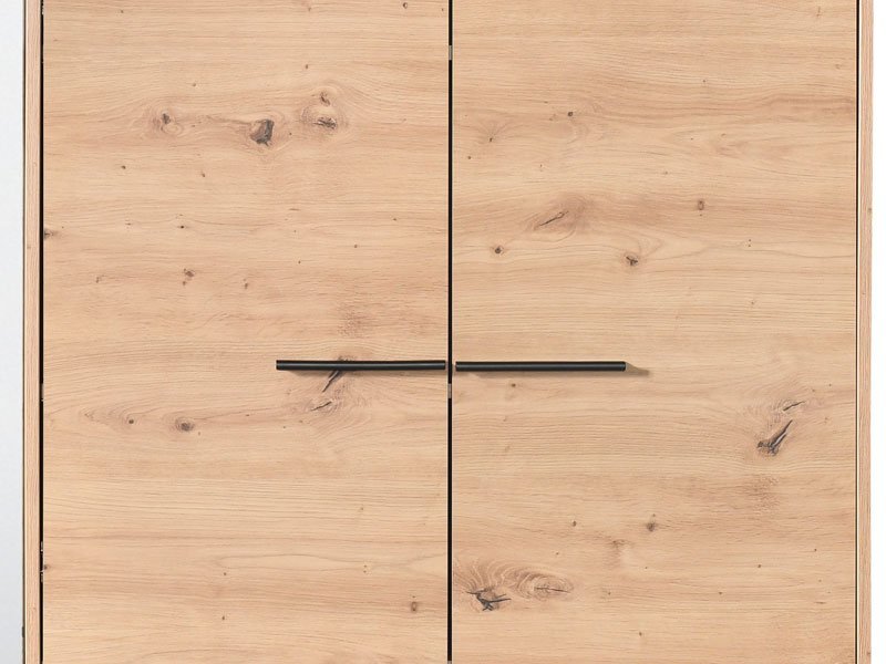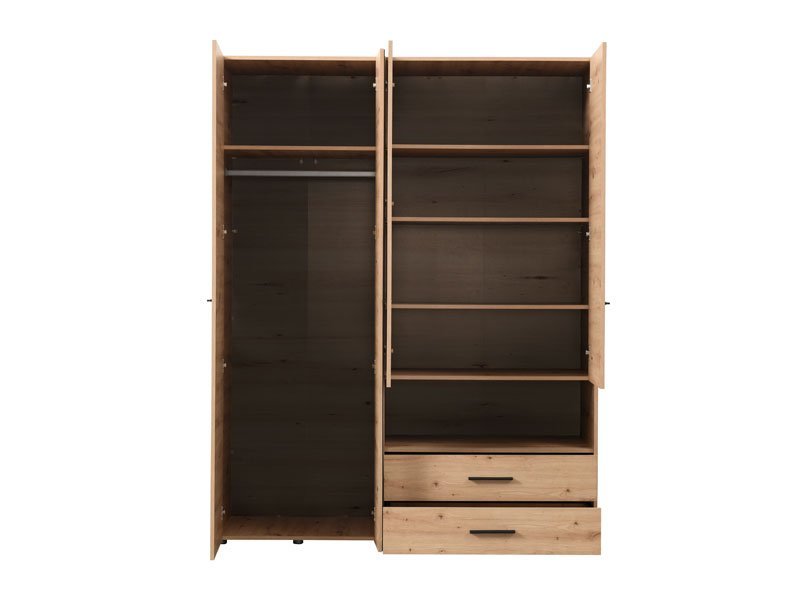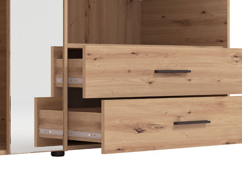 Ormar LEON 4K2FO, u dezenu artisan hrasta, sa garderobnom šipkom sa leve strane, kao i dvokrilno zatvorenim policama, jednom otvorenom policom i dve fioke sa desne strane, funkcionalno će doprineti organizaciji ambijenta. Ogledalo na središnjem delu ormara LEON 4K2FO estetski će oplemeniti i vizuelno povećati ambijent životnog prostora u kome se nalazi.