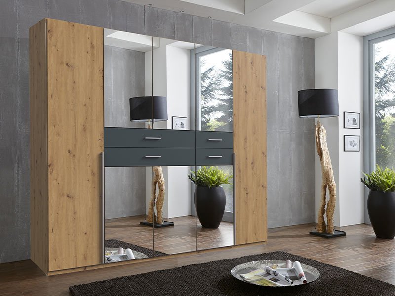 Tačan naziv dezena:korpus iverica artisan, front iverica artisan grafit siva, ogledalo. Ormar MADISON 8V6O4F izuzetno je funkcionalno i estetski privlačno rešenje za uređenje ambijenta spavaće sobe, a sa sobom donosi dozu elegenacije i atraktivnosti zahvaljujući izboru drvo dekora, ali i velikim ogledalima koja se nalaze na tri fronta ovog ormara i imaju sposobnost potpune transformacije enterijera. Upotrebni prostor ovog modela ormara je prilagodljiv potrebama savremenog načina života, a čine ga garderobne šipke, police, dve prostrane i dva manje fioke. *Napomena: Cena je bez dodatne opreme. Preporučujemo Set polica 45 cm W, Ram za garderober 225 W