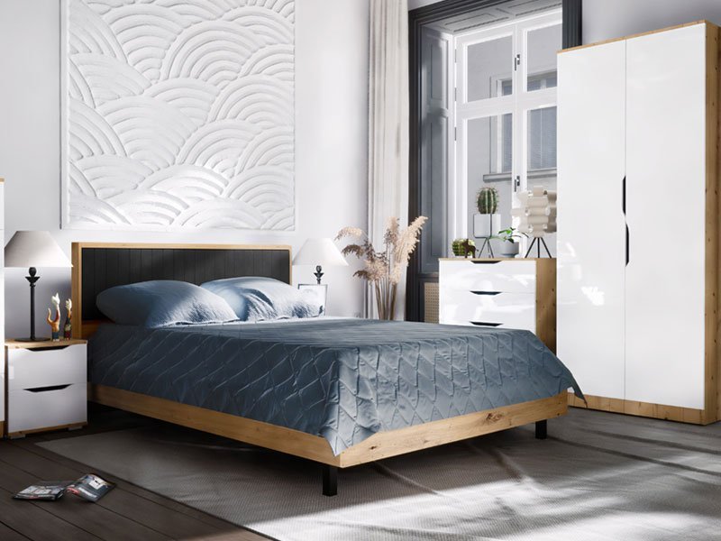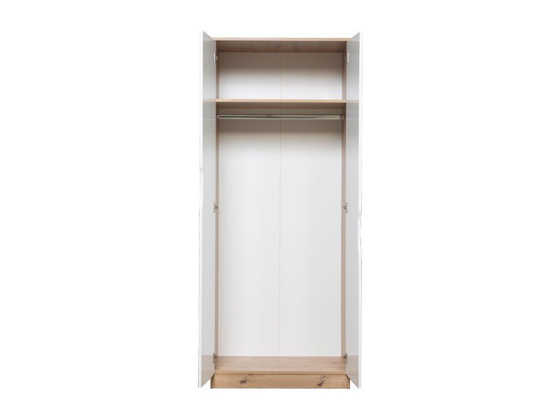 Tačan naziv dezena: korpus iverica artisan, front iverica bela sjaj. Ormar MOLI 2V  sa garderobnom šipkom i nosećom policom namenjen je za odlaganje odeće. Model ormara MOLI 2V ima klasičan mehanizam otvaranja.