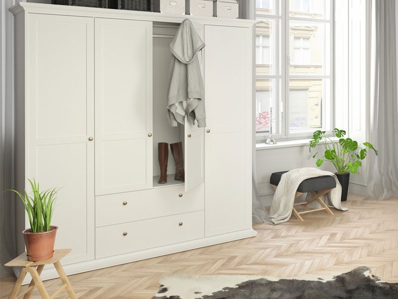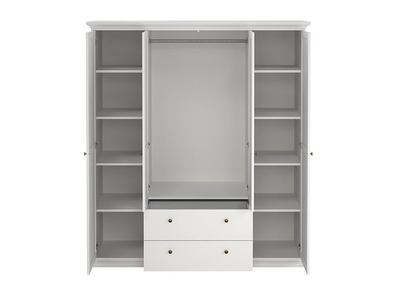 Tačan naziv dezena: korpus iverica bela, front iverica bela. Model četvorokrilnog ormara PARIS 4V2F poseduje prostor za odlaganje u četiri zatvorena dela, kao i dve funkcionalne fioke. Ormar PARIS 4V2F stilski se uklapa u savremene domove i pored praktičnosti značajno doprinosi jedinstvenom estetskom konceptu uređenja životnog prostora.