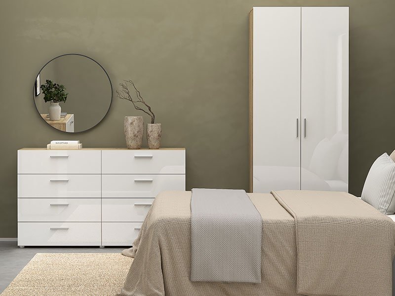 Tačan naziv dezena: korpus iverica natur, front iverica bela sjaj. Ormar PEPE 2V predstavlja atraktivno dizajnersko rešenje. Funkcionalnosti doprinosi garderobna šipka i praktična police. Model ormara PEPE 2V ima klasičan mehanizam otvaranja vrata.