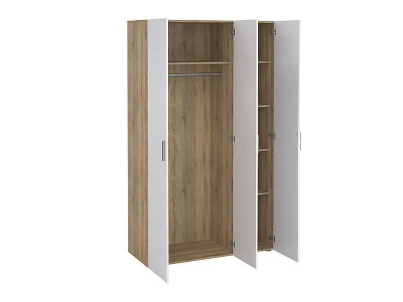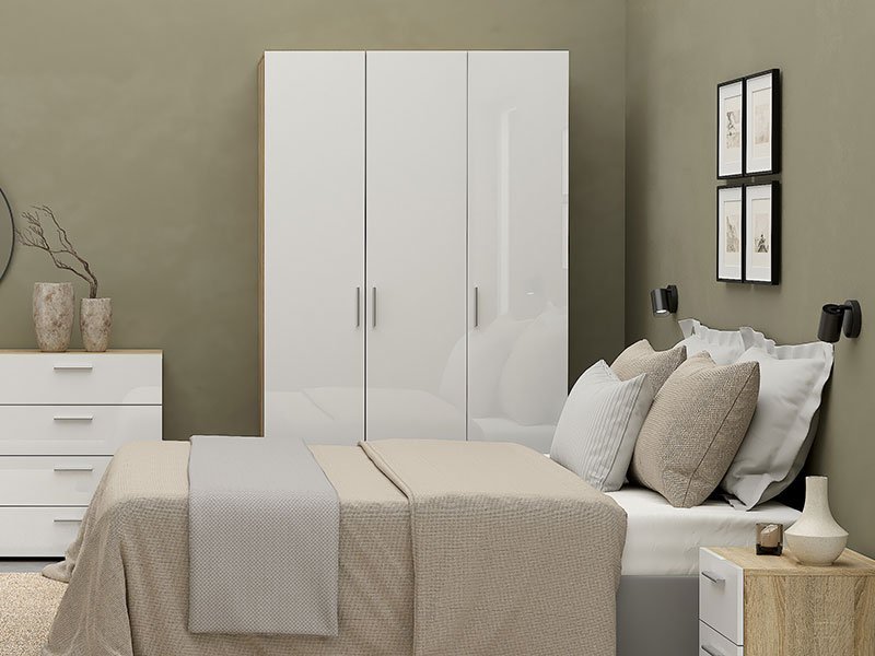 Tačan naziv dezena: korpus iverica natur, front iverica bela sjaj. Ormar PEPE 3V predstavlja atraktivno dizajnersko rešenje. Funkcionalnosti doprinosi garderobna šipka i praktična police. Model ormara PEPE 3V ima klasičan mehanizam otvaranja vrata.