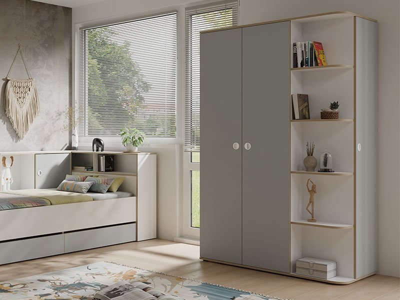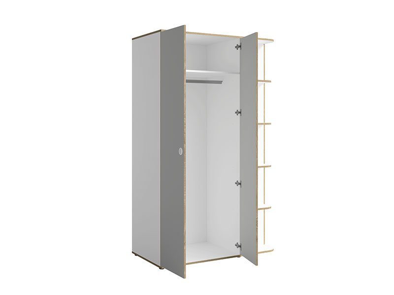 Tačan naziv dezena: korpus/front bela/svetlo siva/natur. Ormar PINIO je moderno dizajnirano rešenje, koje pored funkcionalnog dvokrilnog dela za odlaganje garderobe, poseduje i otvorenu policu za odlaganje knjiga ili dekorativnih detalja. Ormar PINIO je deo istoimene dečije sobe PINIO i sa ostalim elementima čini kompletno ambijentalno rešenje.