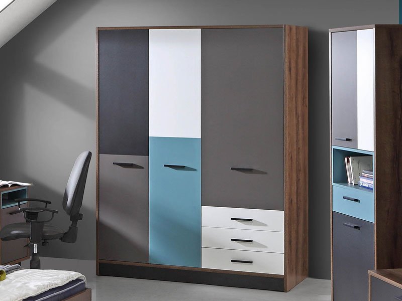 Tačan naziv dezena: korpus iverica Mud Oak, front iverica Uni Wolfram Grey /White/Black/Oriental green. Praktični model ormara RAVEN 140 sa garderobnom šipkom, policama i tri fioke, doprineće boljoj organizaciji prostora.