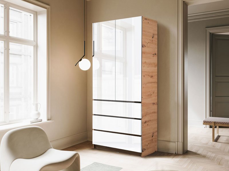 Tačan naziv dezena: korpus iverica artisan, front iverica bela sjaj. Praktični model ormara SEA 2V3F sa garderobnom šipkom, policama i tri fioke, doprineće boljoj organizaciji prostora.
