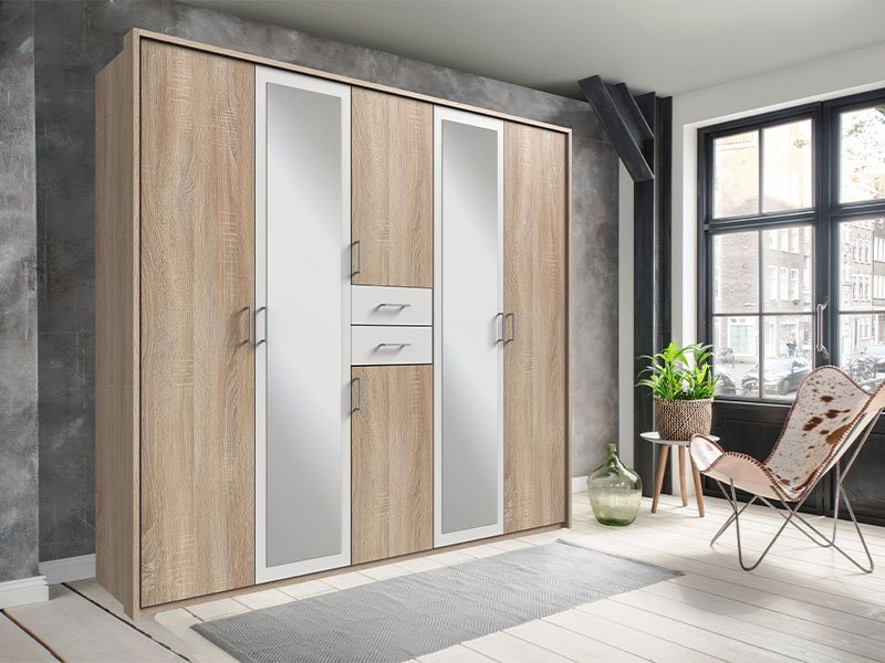 Tačan naziv dezena: korpus iverica sonoma, front iverica sonoma/bela, ogledalo. Ormar SEATLE 6V2O2F izuzetno je funkcionalno i estetski privlačno rešenje za uređenje ambijenta spavaće sobe, a sa sobom donosi dozu elegenacije i atraktivnosti zahvaljujući izboru drvo dekora, ali i velikim ogledalima koja se nalaze na dva fronta ovog ormara i imaju sposobnost potpune transformacije enterijera. Upotrebni prostor ovog modela ormara je prilagodljiv potrebama savremenog načina života, a čine ga garderobne šipke, police i dve manje fioke. *Napomena: Cena je bez dodatne opreme. Preporučujemo Set polica 90 cm W, Ram za garderober 225 W