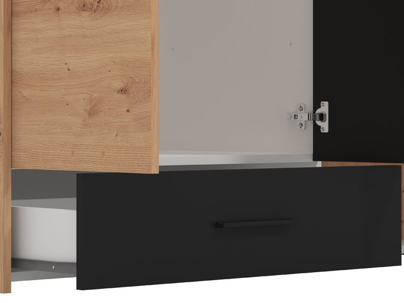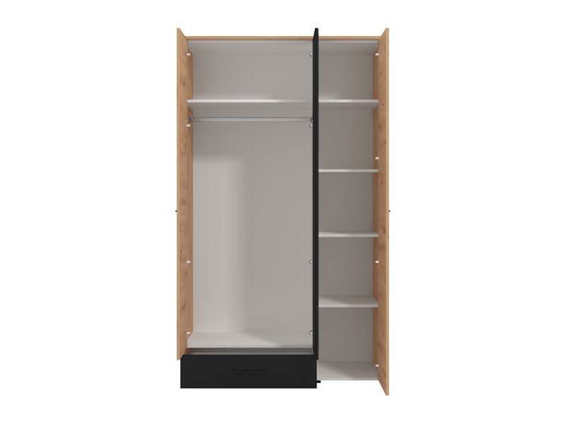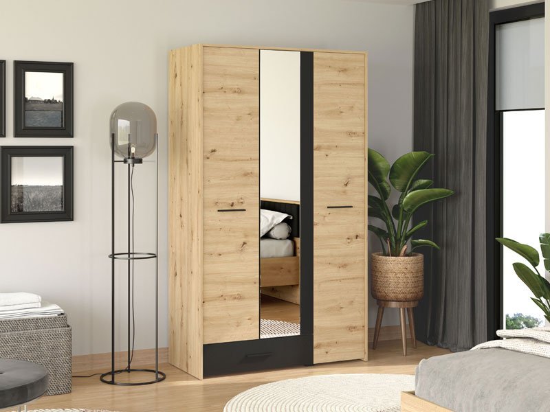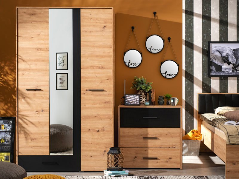 Ormar VARADERO 3K1F1O, u dekoru artisan hrasta i crne, deo je istoimene kolekcije elemenata dečije sobe. Poseduje veoma funkcionalan upotrebni prostor sa sistemom polica, kao i delom sa garderobnom šipkom i policom iznad nje. Dodatni estetski benefit je ogledalo u središnjem delu.