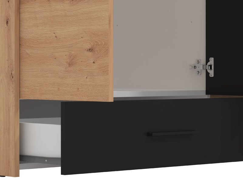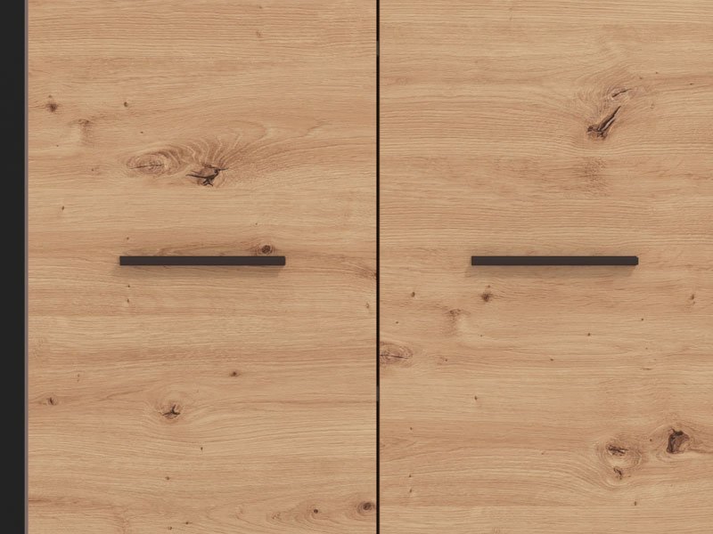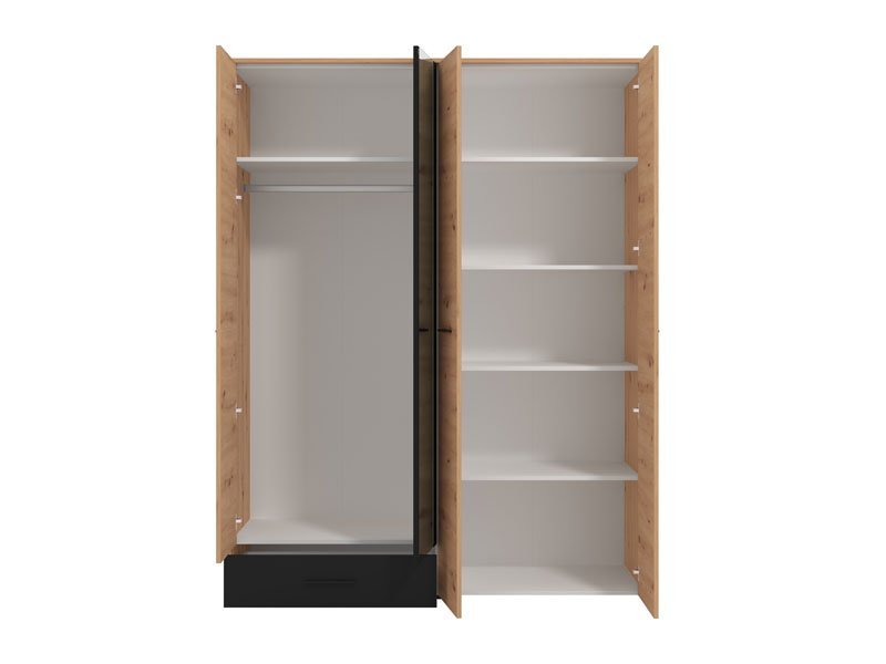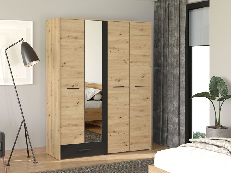 Ormar VARADERO 4K1F1O, u dekoru artisan hrasta i crne, deo je istoimene kolekcije elemenata dečije sobe. Poseduje veoma funkcionalan upotrebni prostor sa sistemom polica, kao i delom sa garderobnom šipkom i standardnom policom iznad nje. Dodatni estetski benefit je ogledalo u središnjem delu.