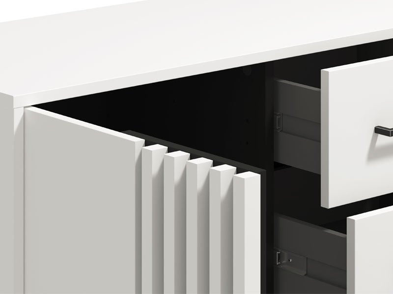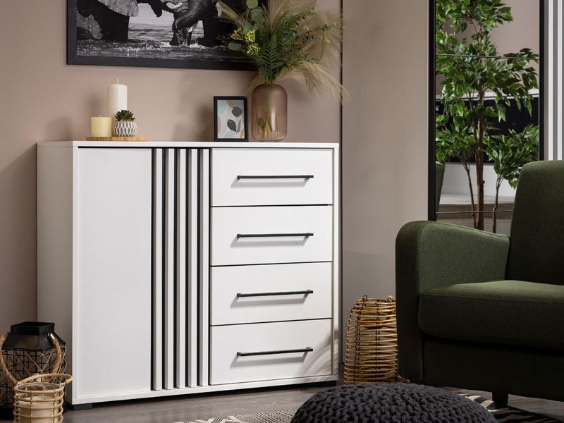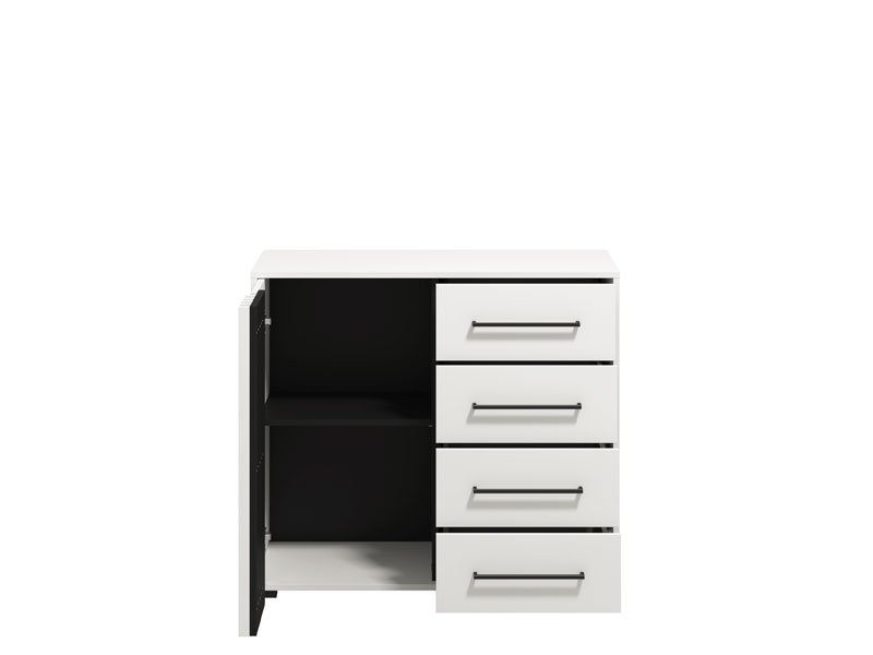 Komoda  ASCALON 2K4F 90  u kombinaciji opak belog dekora, crnog dekora i bele mat folije, moderno je dizajniran i autentičan komad nameštaja koji će, doprineti kako estetici, tako i funkcionalnosti ambijenta spavaće sobe.  Odlično raspoređen upotrebni prostor čine četiri praktične fioke u desnom delu, kao i zatvoreni pregradni deo sa leve strane. Deo je istoimenog sistema elemenata za opremanje spavaće sobe ASCALON, moderne dizajnerske forme.