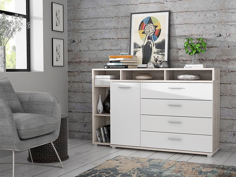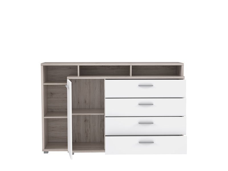 Komoda BEACH 4F1V u kombinaciji opak bele i sand hrasta, naglašava estetski doživljaj enterijera i u potpunosti je usklađena sa savremenim životnim navikama. Pored izuzetne praktične primene koju ističu jedan zatvoreni pregradni deo, četiri prostrane fioke i otvorena polica, odličan je izbor za uređenje različitih ambijenata doma.