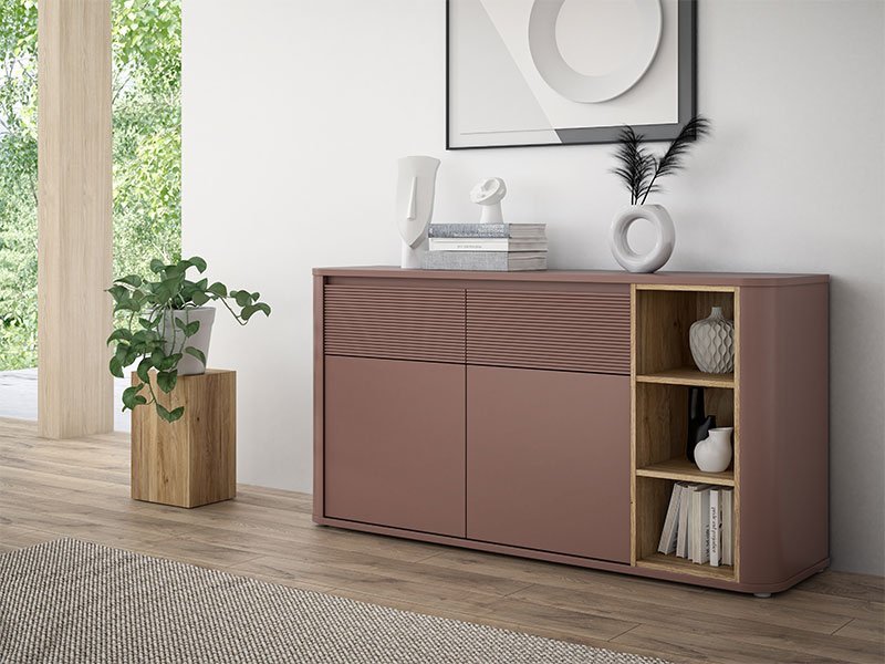 Tačan naziv dezena je: konstrukcija iverica Terracota, front mdf Terracota. Komoda BREATHTAKER predstavlja izuzetno moderno rešenje za opremanje ambijenta dnevnog boravka. Upotrebni prostor čine dva zatvorena pregradna dela i jedan deo sa otvorenim policama.