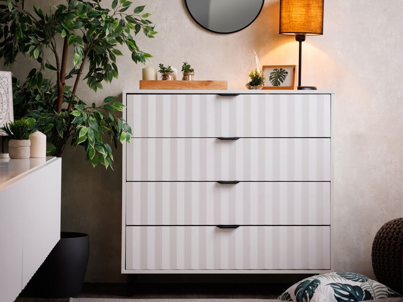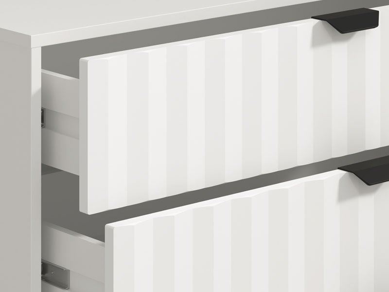 Komoda BREST 4F, u kombinaciji opak belog dekora i bele mat folije dizajnirana je tako da zahvaljujući upotrebnom prostoru koji obezbeđuju četiri prostrane fioke, spada u elemente sa velikom upotrebnom vrednošću. Komoda BREST 4F je pogodna za opremanje predsoblja, dnevne zone, dečije ili spavaće sobe.