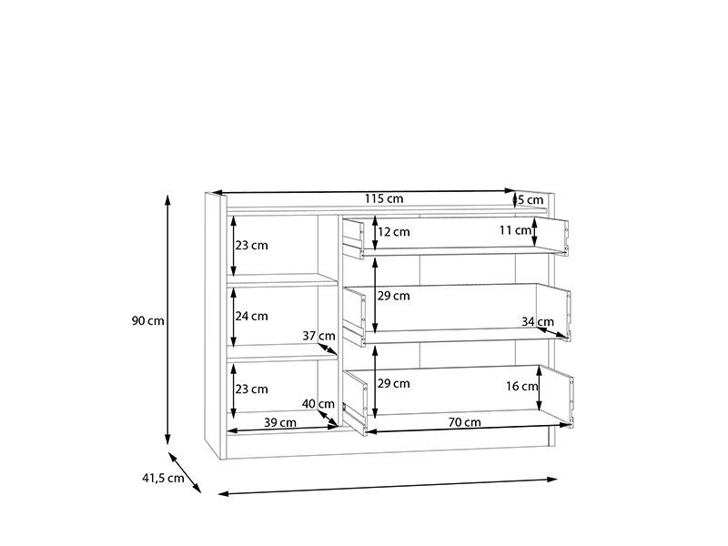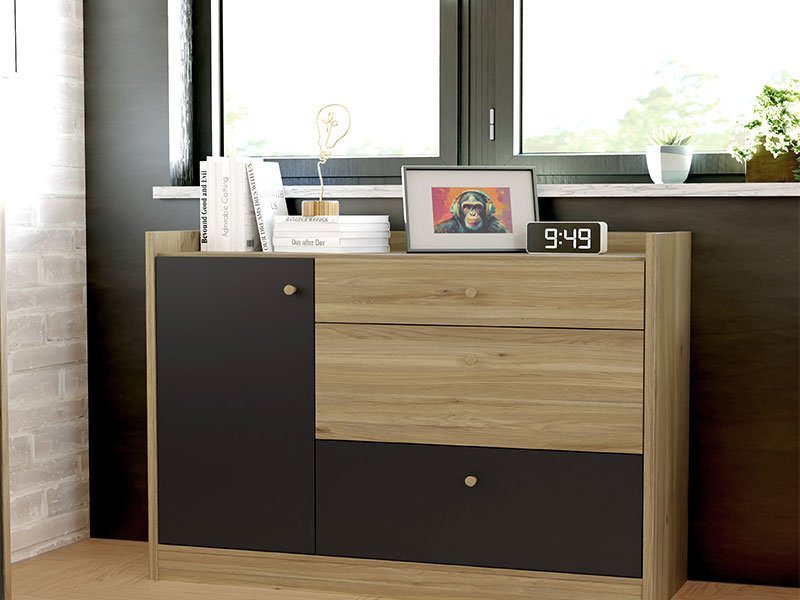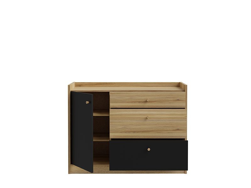 Tačan naziv dezena: korpus iverica Mauvella hrast, front iverica Mauvella hrast/crna . Odlično raspoređen upotrebni prostor ove komode čini zatvoreni pregradni deo i tri praktična fioke.