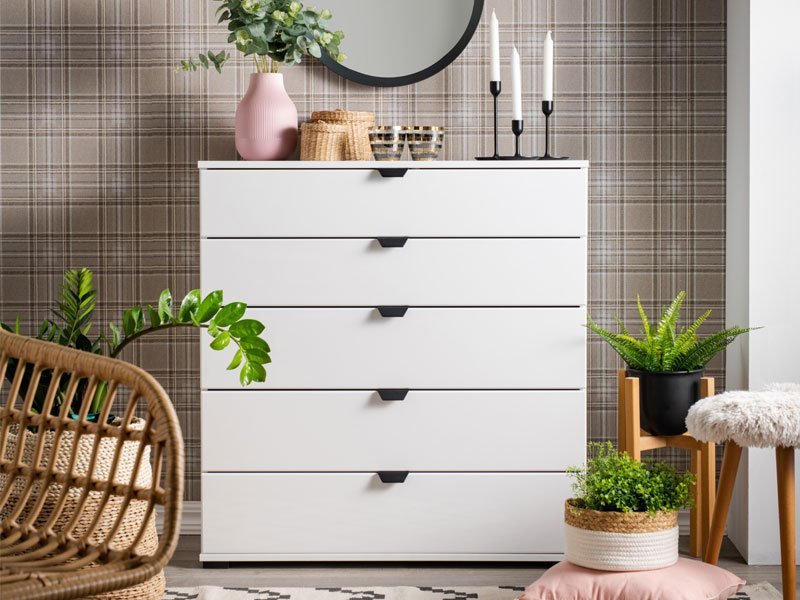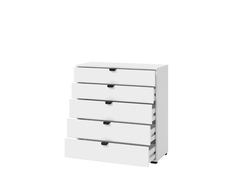 Komoda DUERO 5F 90, u belom dekoru dizajnirana je tako da zahvaljujući upotrebnom prostoru koji obezbeđuje pet prostranih fioka, spada u elemente sa velikom upotrebnom vrednošću. Komoda DUERO 5F 90 je pogodna za opremanje predsoblja, dnevne zone ili spavaće sobe.