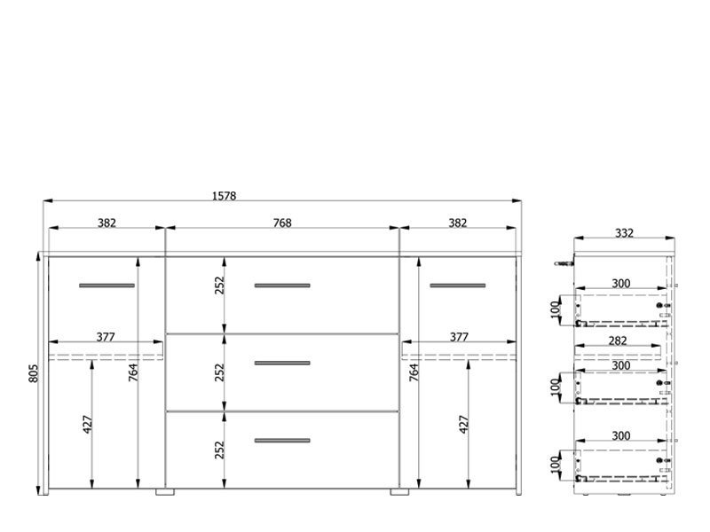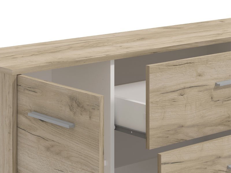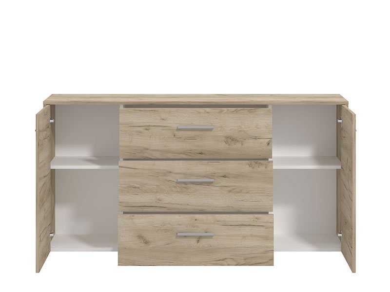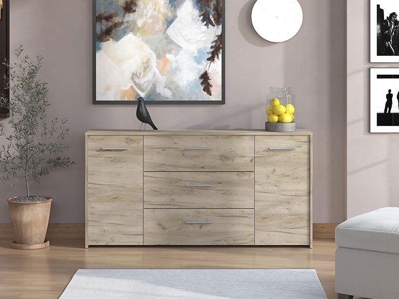 Komoda GARONA 3K3F u dekoru sivog hrasta doprinosi funkcionalnosti i eleganciji čitavog ambijenta. Odlično raspoređen upotrebni prostor ove komode čine dva zatvorena dela sa policom sa leve i desne strane, kao i tri praktična fioke u središnjem delu.