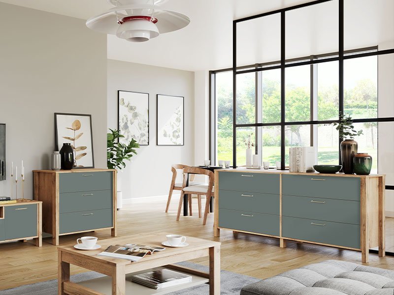 Tačan naziv dezena: korpus iverica dab wotan, front iverica zelena. Komoda INDYGO 6F je funkcionalni dodatak za opremanje dnevnog boravka. Kombinacija dekora doprinosi atraktivnosti i ističe ovaj komad nameštaja u prostoru. Upotrebni prostor se sastoji od šest funkcionalnih fioka.